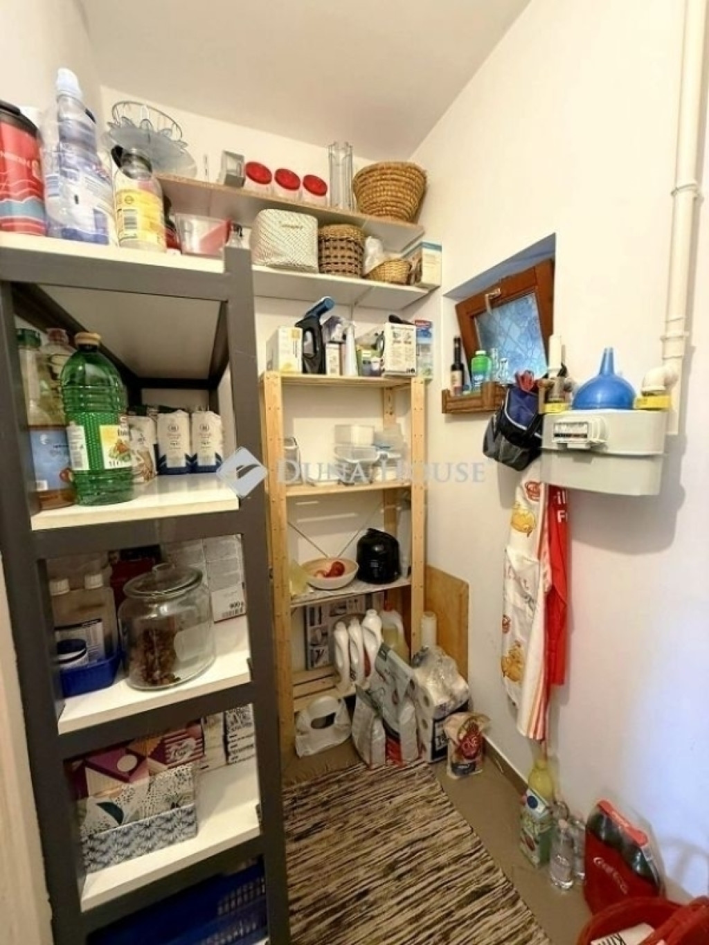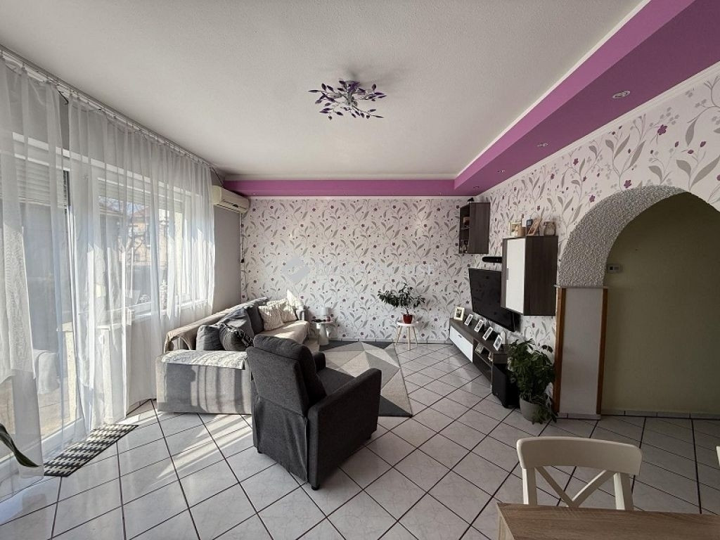 Az utca szintjénél magasabban helyezkedik el, néhány lépcsőfokot felfelé közelíthetjük meg. A lakás két terasszal rendelkezik, melyek közül az elsőt, a bejárat előttit a tulajdonos beépítette, kialakítva ezzel egy zárt előteret. Minden helyiség kerámia lappal burkolt, a kellemes hőérzetről padlófűtés gondoskodik. Boltívekkel került leválasztásra egymástól a nappali és a konyha, elérve ezzel a tágas térérzet hatását, mégis meghagyva a helyiségek különböző funkcióját. Kis közlekedőből érhető el a fürdő + WC, valamint a kamra. A hátsó teraszra a nappaliból juthatunk ki.