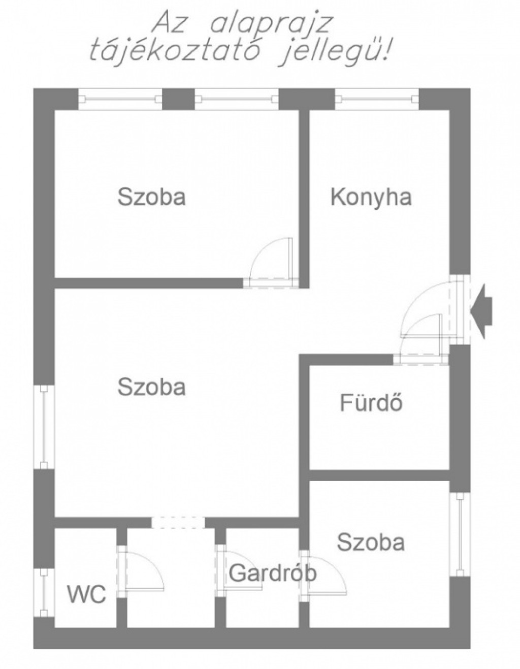 A szobák burkolata parketta. A konyha, fürdőszoba, külön WC, közlekedő járólapos.