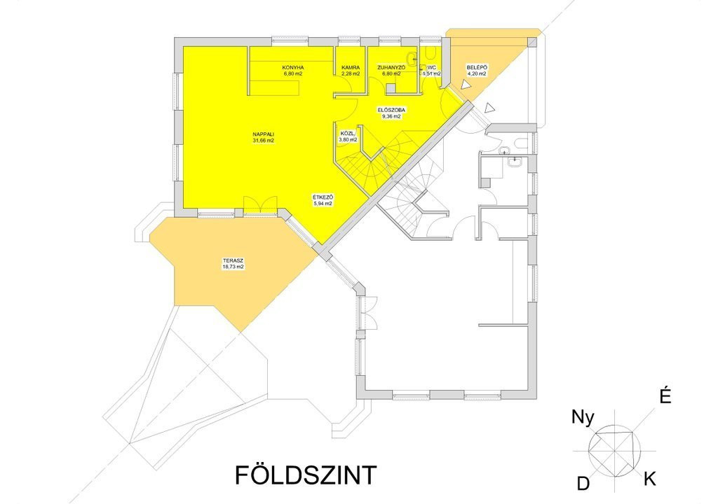 A háromszintes (alagsor + földszint + tetőtér), kétállásos gépkocsitárolóval rendelkező, kiváló tájolású és ezért valóban napfényes fél családi ház kellemes terasszal csatlakozik a saját kertjéhez. A szintek között kényelmesen járható lépcső biztosít kapcsolatot. Az amerikai konyhás nappali valóban tágas, a konyha és étkezőrésszel együtt 44 m2 alapterületű és a konyharész mellett, abból nyílóan található a kamra is.