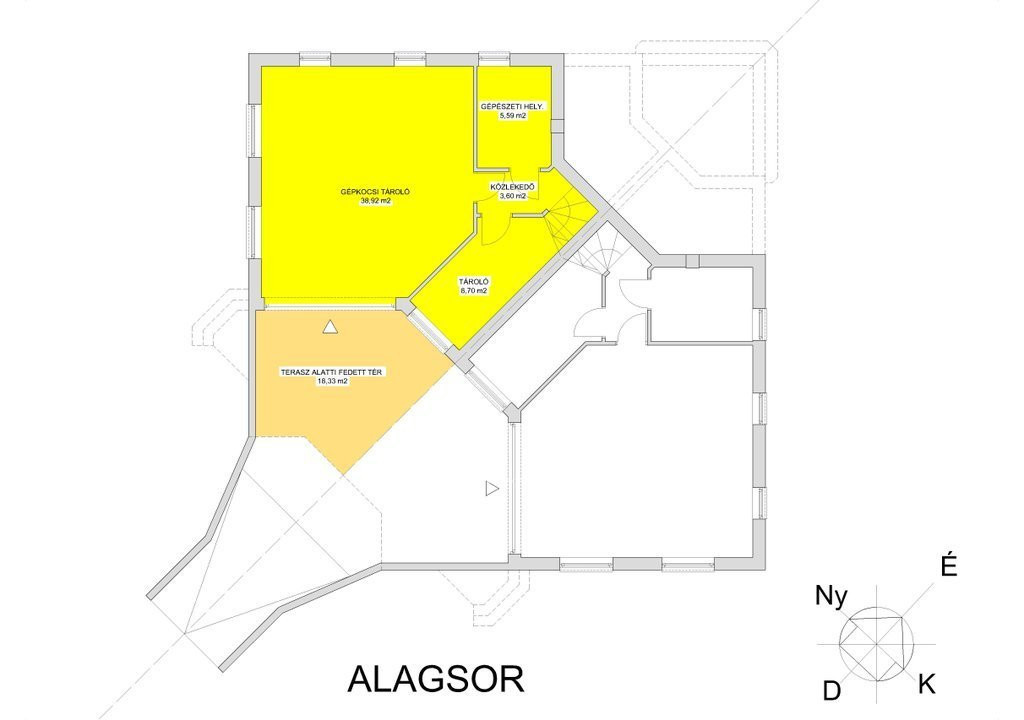 Az alagsorban külön gépészeti helyiség található és egy ugyancsak jól berendezhető és használható tároló is úgy, hogy a gépkocsitárolóba beálló két személygépkocsi mellett még marad hely tárolásra vagy barkácsolásra is. Az alagsor sem sötét, mert valamennyi helyisége ablakkal megvilágított.
