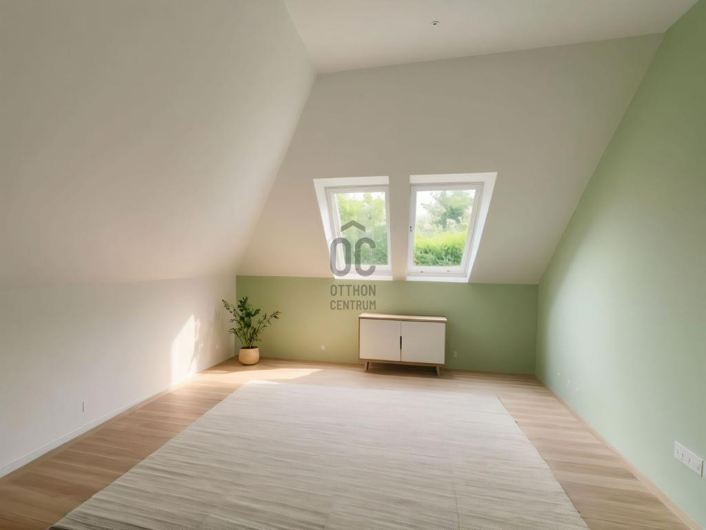 Az emeleten, ahogy a lépcsőről megérkezünk, egy kis nappalit/közlekedőt találunk, igény szerint ezen a részen egy szoba kialakítható.