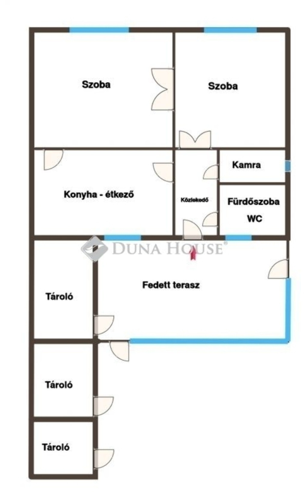 Elrendezését tekintve kétszobás, melyek egybe és külön is nyílóak. A szobákon kívül tágas, étkezős konyha, zuhanyzós fürdőszoba mellékhelyiséggel, illetve még egy kamra is helyet kapott. A ház előtt egy fedett terasz helyezkedik el. A fagerendás, sátortetős padlás további lehetőséget rejt magában a tetőtér beépítésére, ezzel bővítve a lakóteret. A házhoz tárolók is tartoznak. Az otthon melegét gázkonvektor biztosítja. A telek 534 nm.