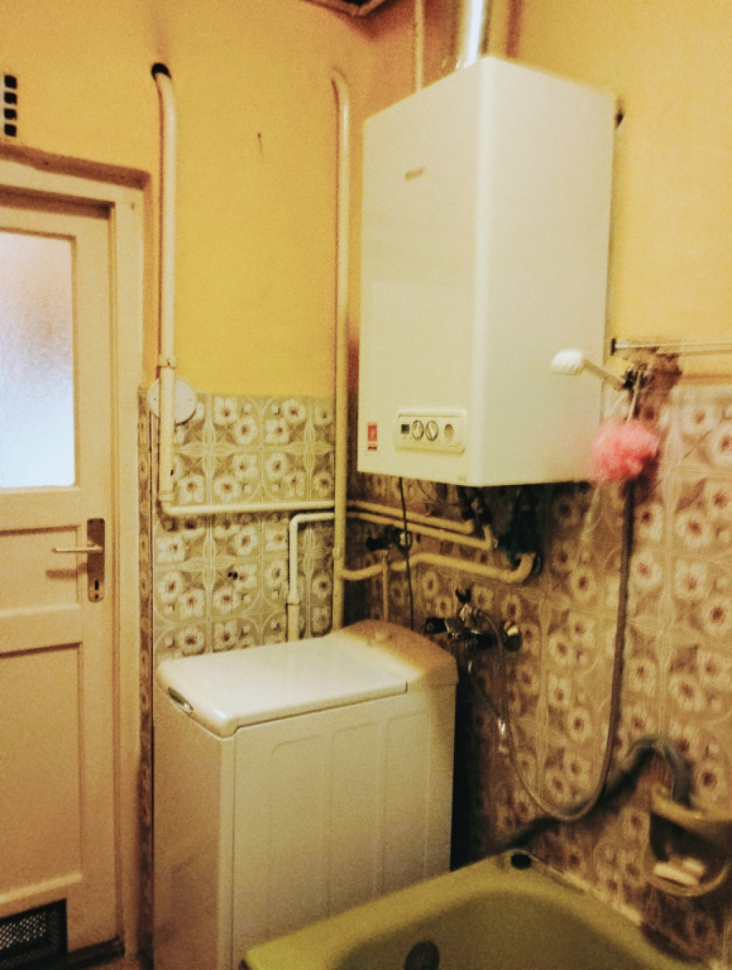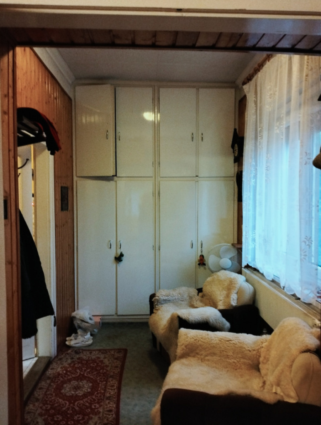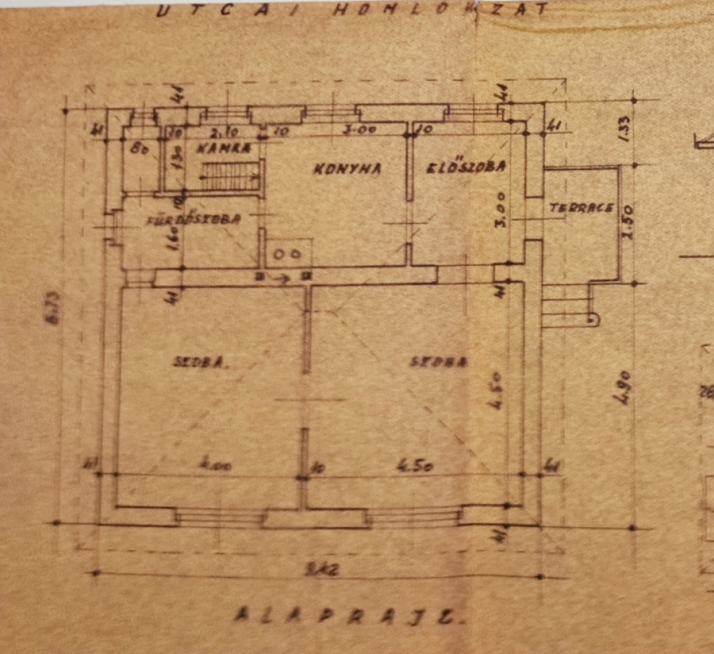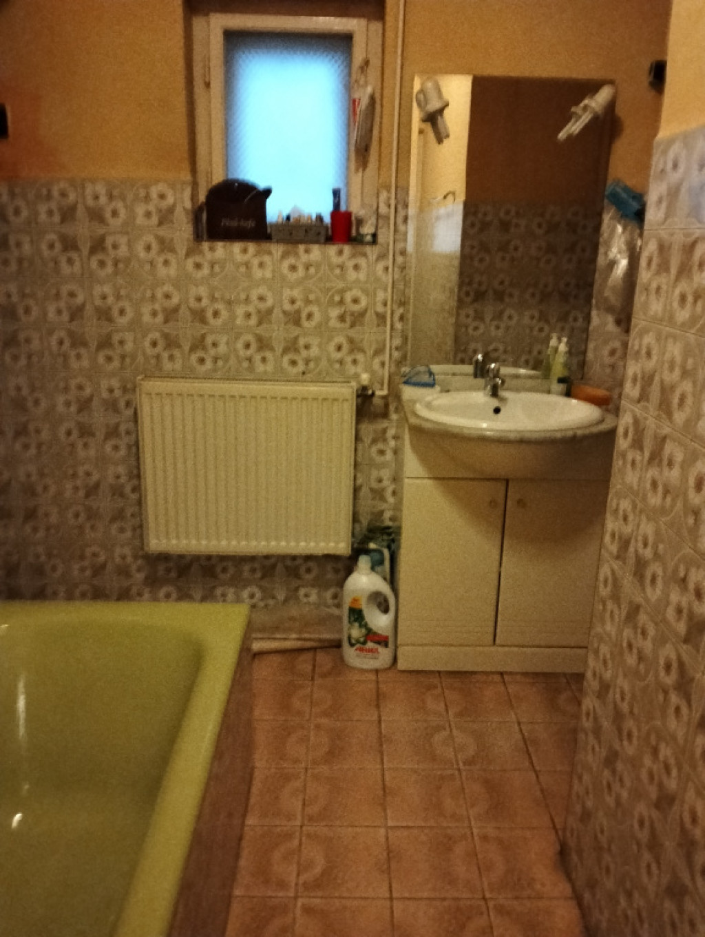 kamra,előszoba,fürdő amelyből nyílik a wc, beépített terasz, minden helyiség ablakos, a szobák utcára néznek. Az otthon melegéről kombi A cirkó kazán gondoskodik radiátoros hőleadókkal.