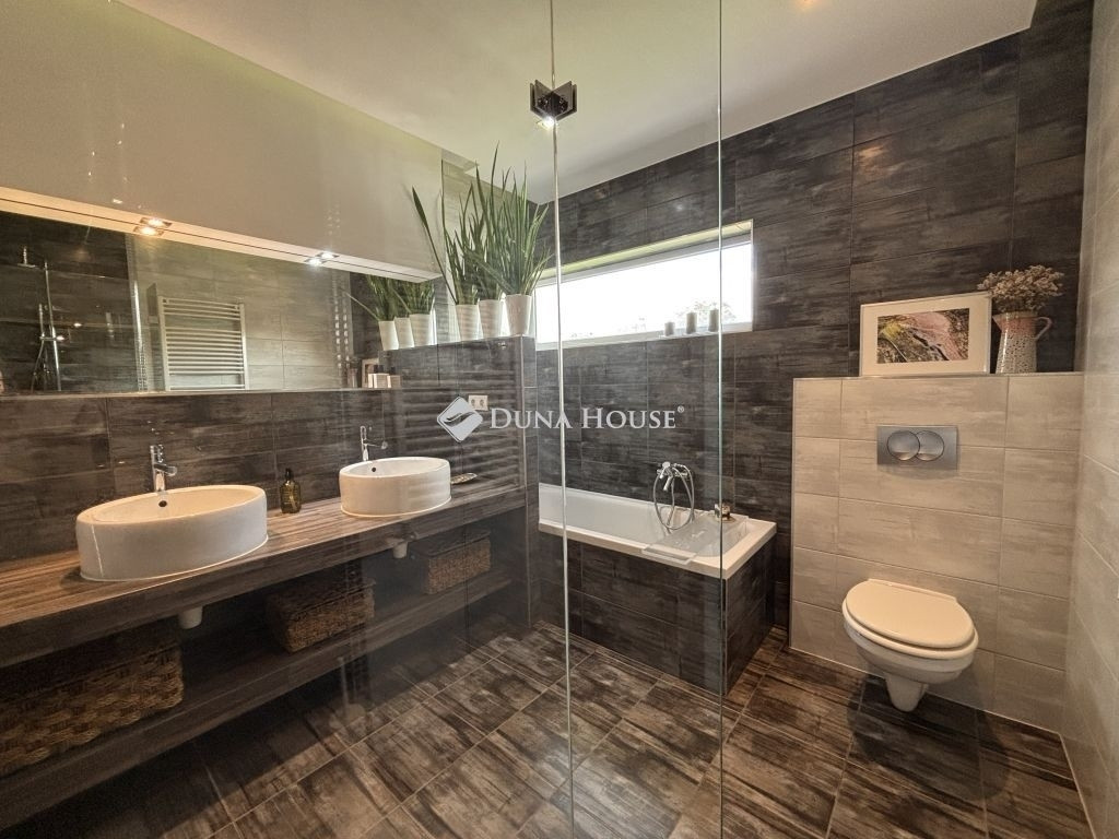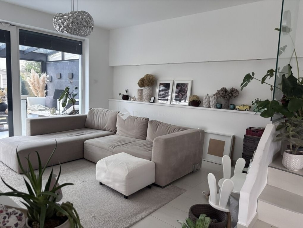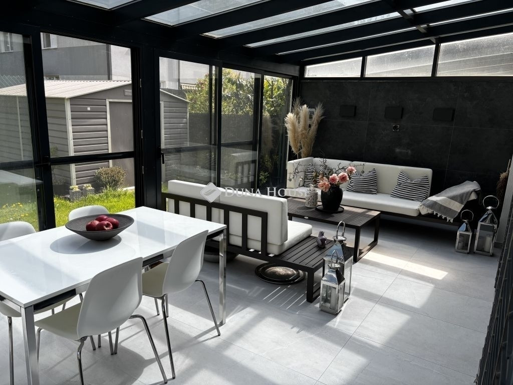 Az ingatlan 2015-ben készült,magas műszaki tartalommal és minőségi kivitelezéssel,amelynek a lakóterülete két szinten 94 nm,amelyhez tartozik egy 15 nm-es garázs és az udvaron,a viacoloros burkolattal ellátott részen két autó részére udvari beálló,illetve a ház udvari frontján található egy 27 nm-es terasz,amelyet a tulajdonosok egy zárható és fűthető télikertté varázsoltak.A ház alsó szintjén került kialakításra az előszobából belépve a kézmosós toalett és teljesen modern,egy légterű 35 nm-es nappali+amerikai konyha.A felső szinten három hálószoba,gardrób szoba és egy fürdőszoba található.