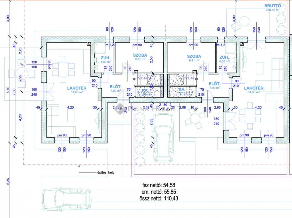 110,43 négyzetméter hasznos lakótérrel rendelkezik, mely egy 266,64 négyzetméteres telken fekszik. Nappali+4hálószobával rendelkezik, a szobák minimum 12 négyzetméteresek. A nappaliból egy 18négyzetméteres teraszon keresztül juthatunk ki a csodás saját privát kertünkbe.