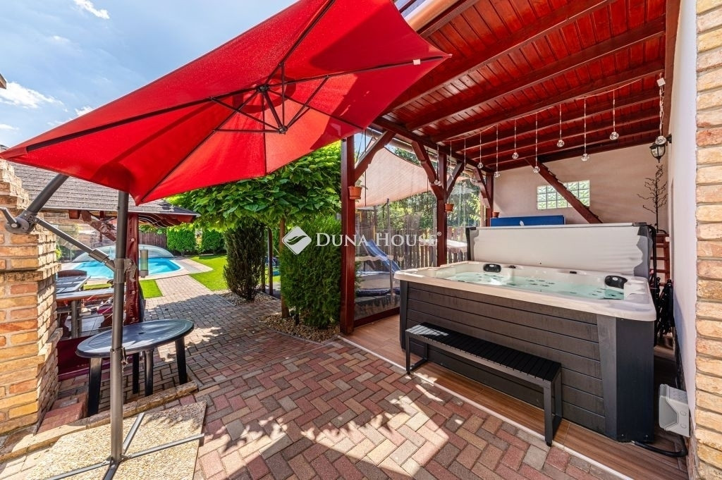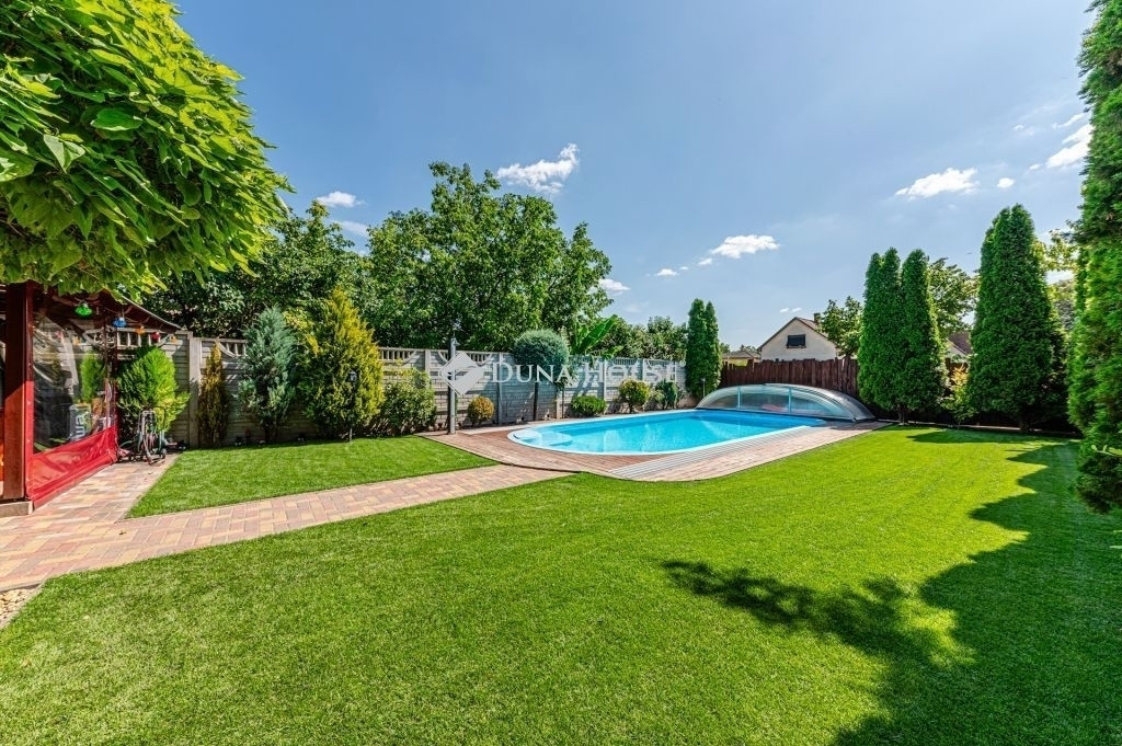 A mediterrán hangulatú kertben nagy méretű (10*4*1,5 m) fedhető medence, játszótér, kerti kemence és grillező, valamint egy szaletli is helyet kapott.