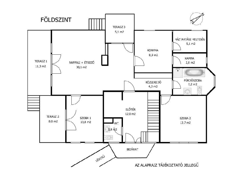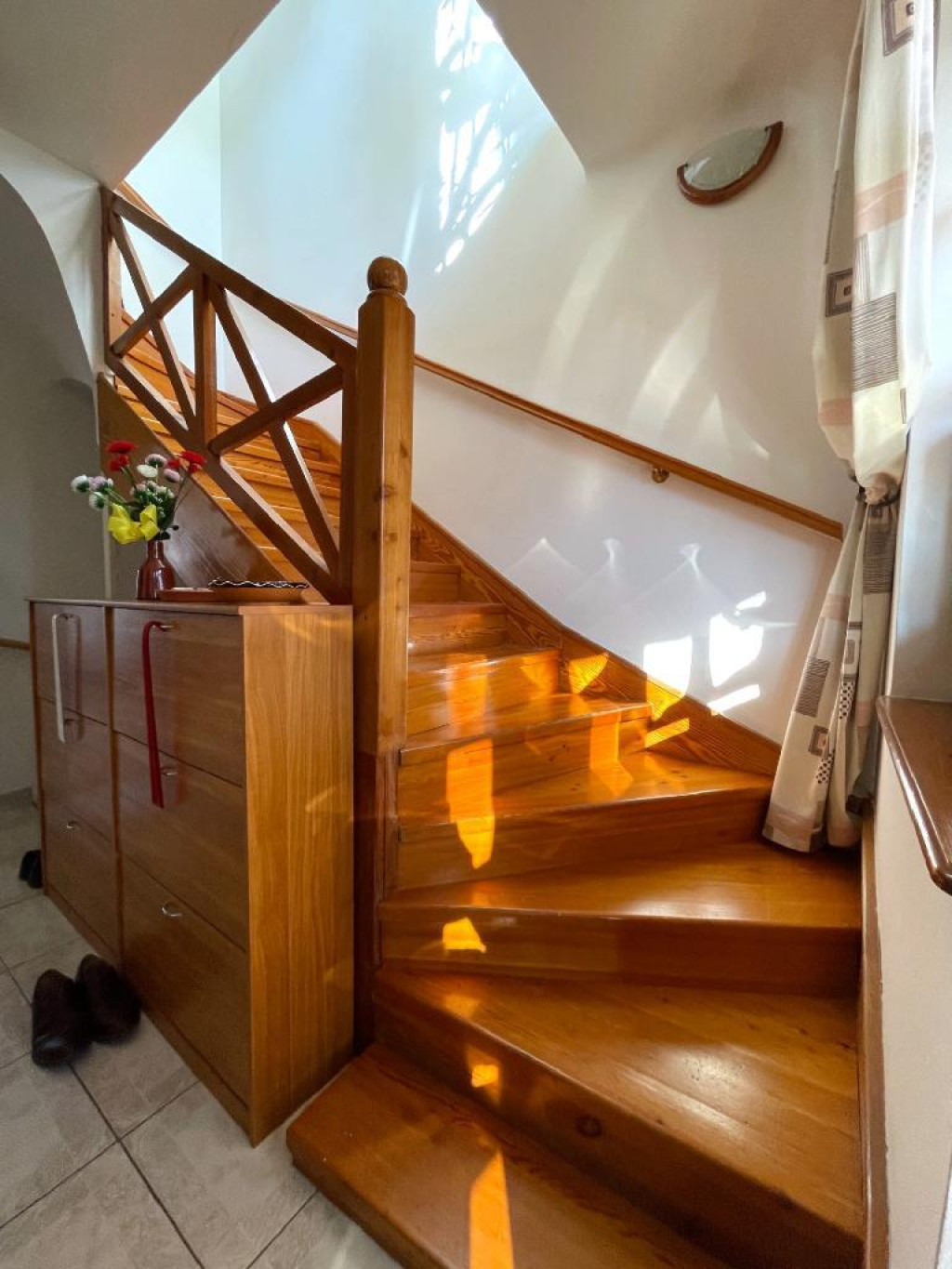 - A zárt lépcsőház, amely a két lakás belső tereit nem érintve használható, tehát a lakók egymástól függetlenül, egymást nem zavarva tudnak a két szintre közlekedni.