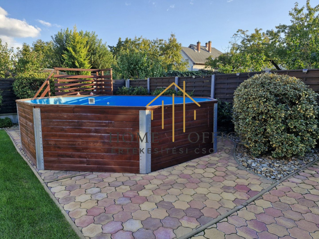 Az udvar első része térkővel burkolt, hátul zöld gyep van, ahol fedett grillező, merev falú, fa berakású medence, fúrt kút és felfújhatós jakuzzinak előkészített rész található.