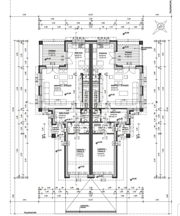 Földszint: nappali + étkező: 31,6 m², külön konyha: 10,5 m², fürdőszoba, háztartási helyiség, szélfogó, garázs: 17,1 m², terasz: 11,6 m².,