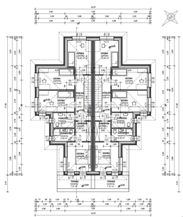 Emelet: 4 külön nyíló hálószoba (kb. 12 m² mindegyik), fürdőszoba + külön zuhanyzó, gardróbszoba, közlekedő.