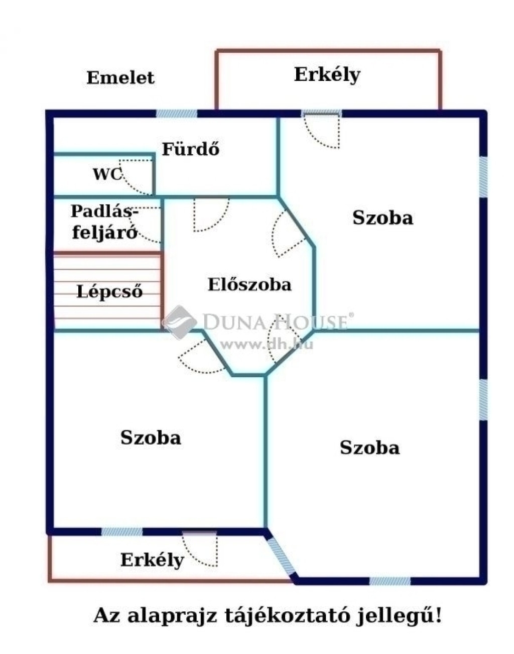Az emeleten fürdő+WC, padlásfeljáró és 3 tágas szoba található, az egyik szobához erkély is tartozik.