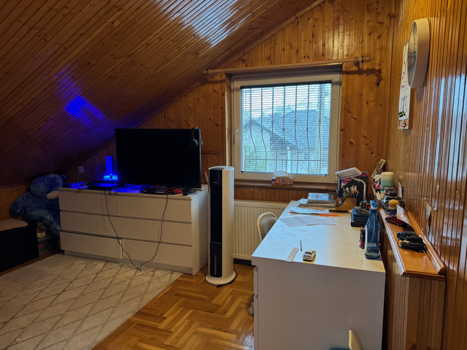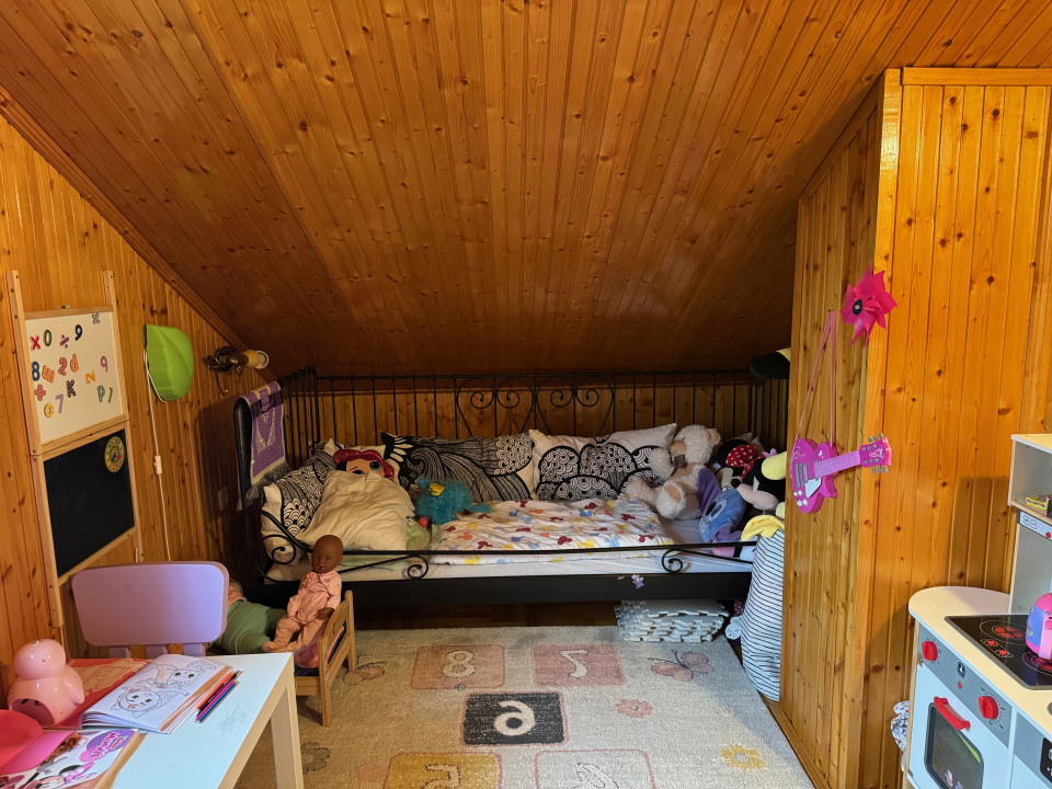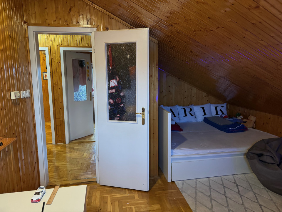 Felső szint: 2 szoba Velux tetőablakokkal, galéria nappalival, külön gardróbszoba, fürdőszoba zuhanyzóval, külön WC.