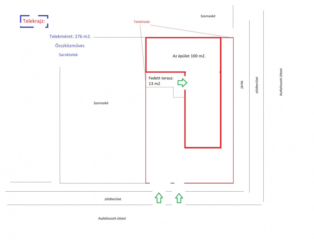 - Utcafronti szélesség: saroktelek, 21,95 m.