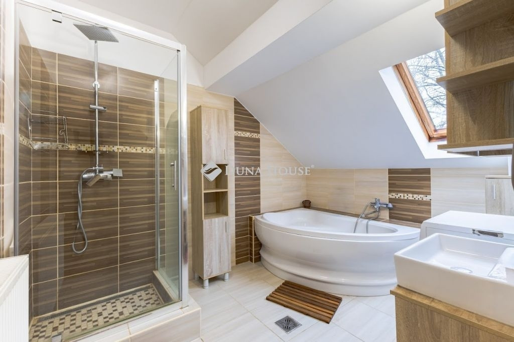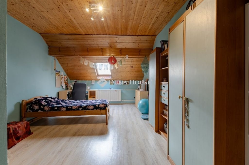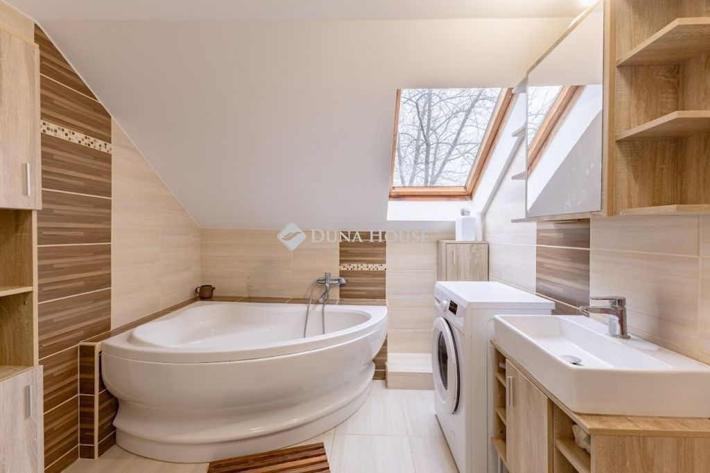 Az alsó szintről masszív, beton szerkezetű lépcsőn érhetjük el a tetőteret, ahol egy előtér, egy tároló, a konyha étkezővel, valamint 2 szoba, egy kádas fürdőszoba és a külön-bejáratú WC került kialakításra 2023-ban.
