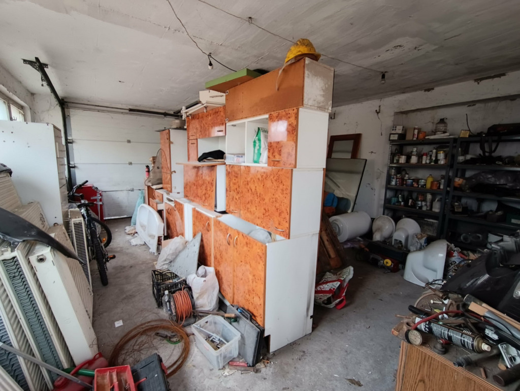 telek bal oldalának közepén található dupla fedett garázs, amely két szintes, a felső szinten külön kb. 30 m2-es GARZONLAKÁSSAL!