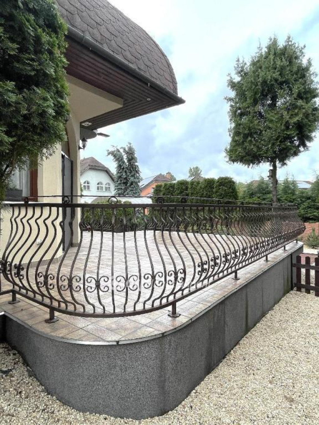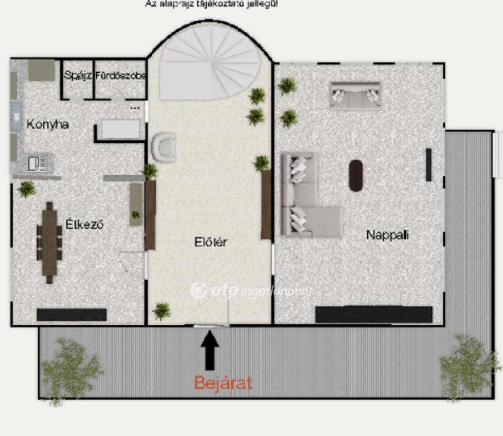 A házból egy 50 nm-es teraszra lépünk ki, ami körbe öleli a házat és kiváló helyszíne lehet egy kis pihenésnek, reggeli kávézásnak a szabadban.