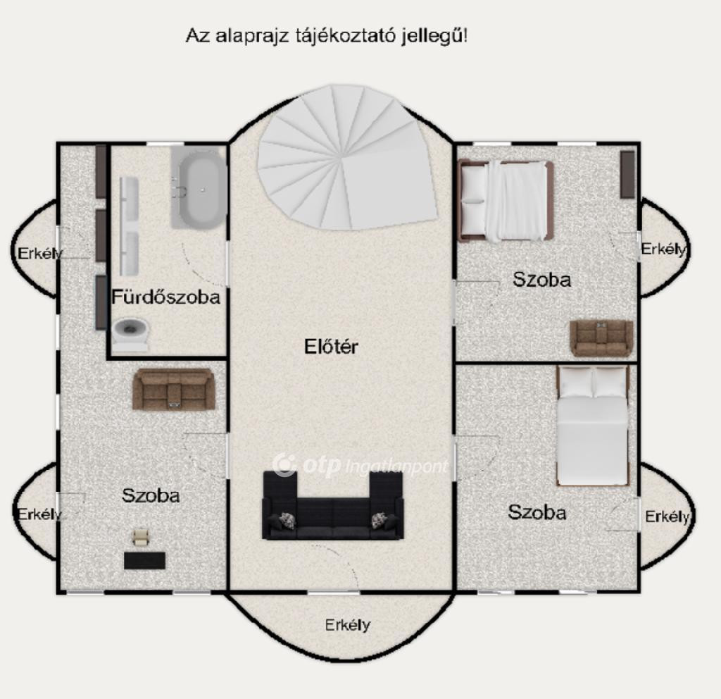 A terek nagyvonalúan letisztultak, a földszinten a nagy 56 nm-es nappali és az 52 nm-es konyha-étkezővel biztosítják a közös élet színtereit, míg az emeleten a három külön nyíló, tágas emeleti szoba és a hozzájuk tartozó erkélyek kiváló lehetőséget adnak az elvonulásra, privát szférára.