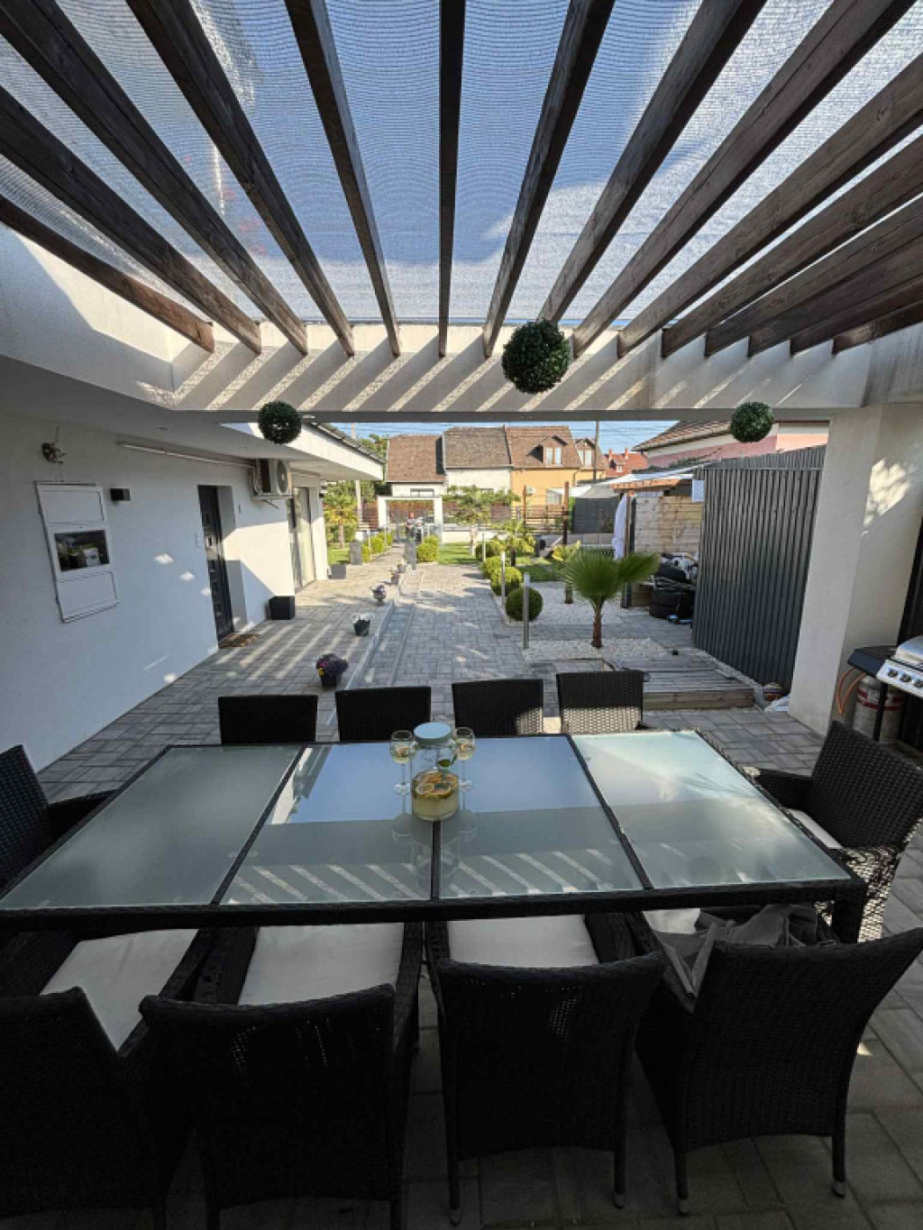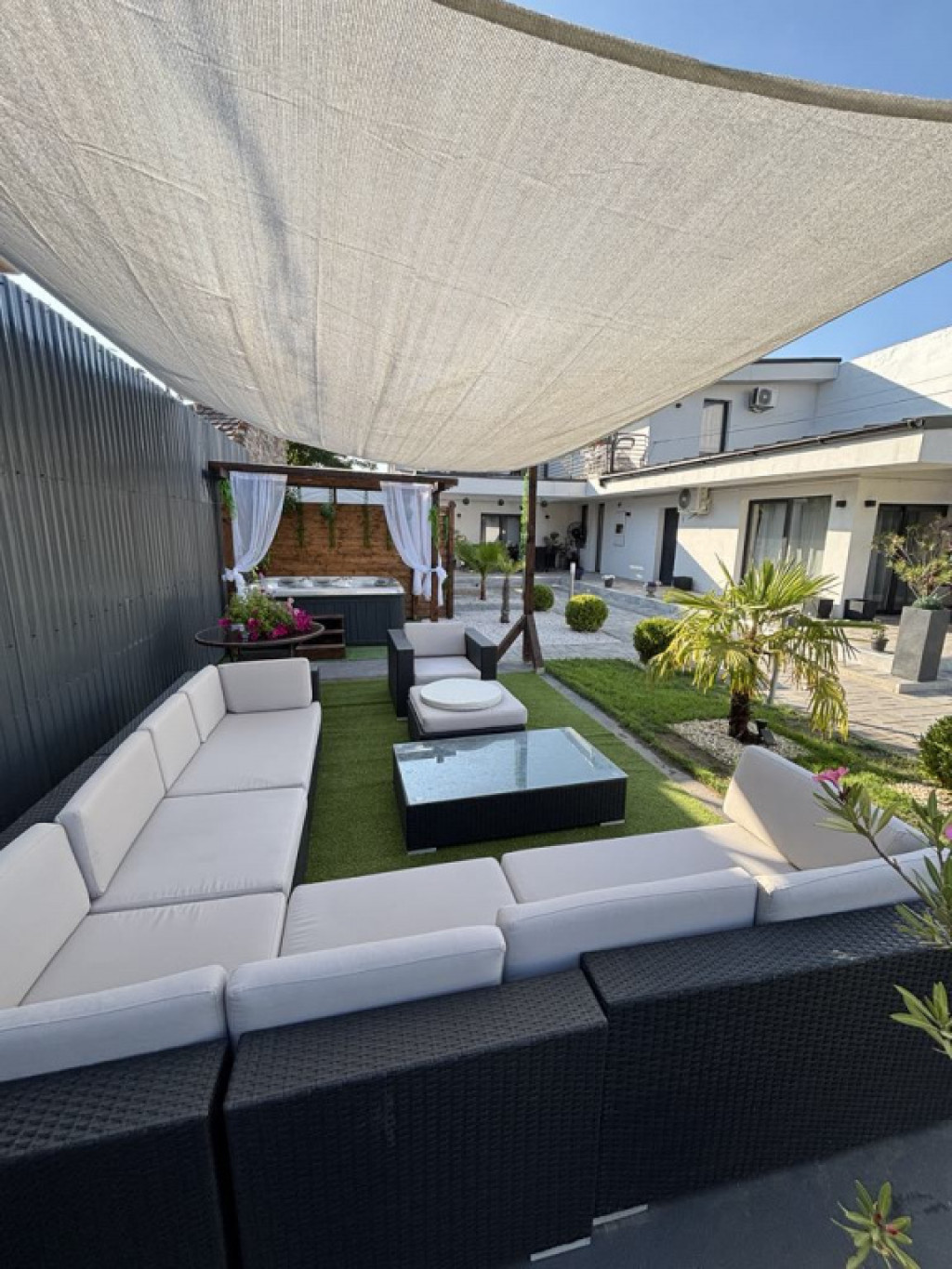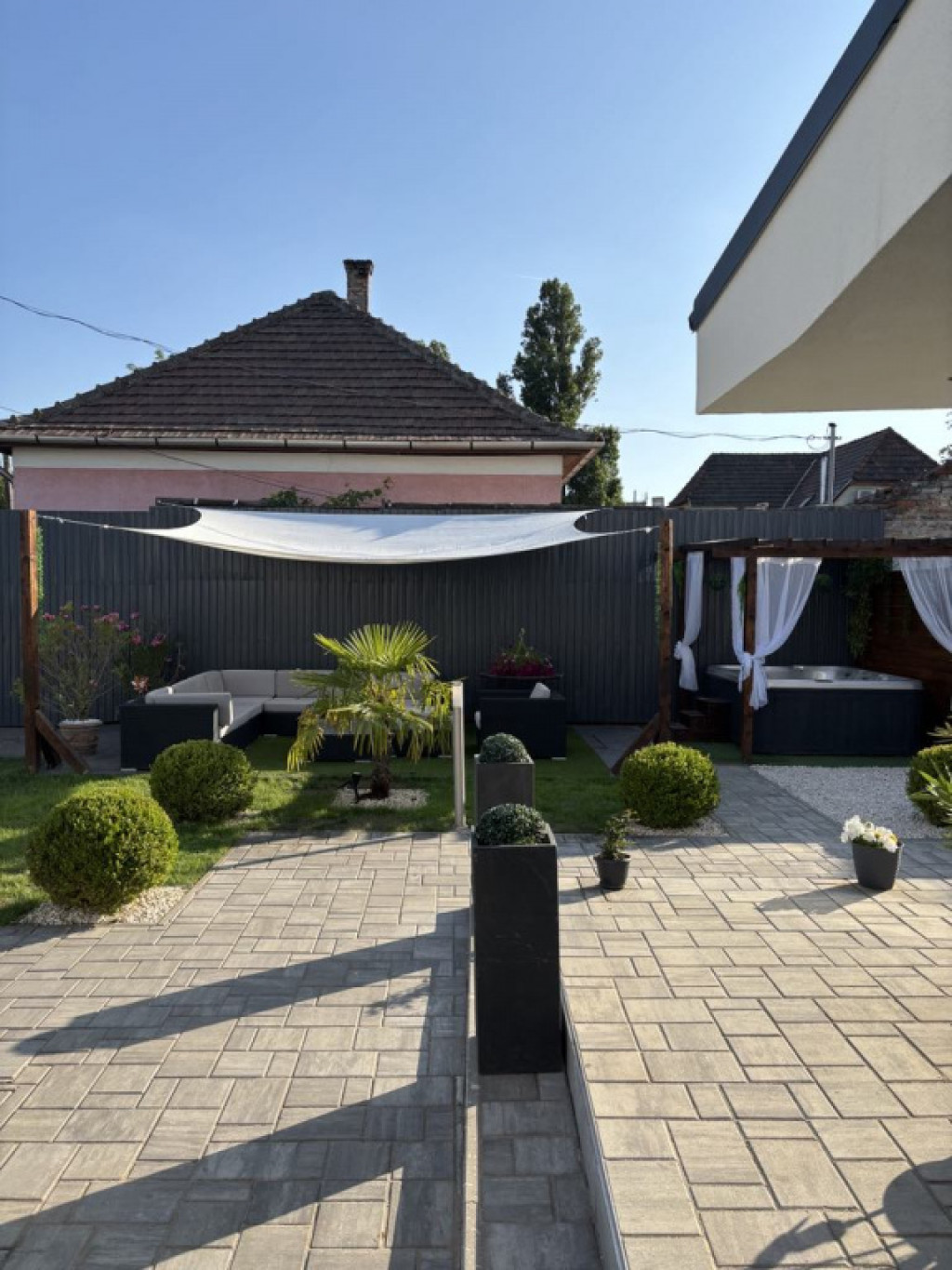 Az ingatlan igazi ékköve a gondosan tervezett, mediterrán hangulatú udvar. A déli tájakat idéző növényzet és a tágas, nyitott tér egy privát oázist teremt a városban. A teljes ellazulásról egy 5 személyes jakuzzi gondoskodik, amely a vételár részét képezi!