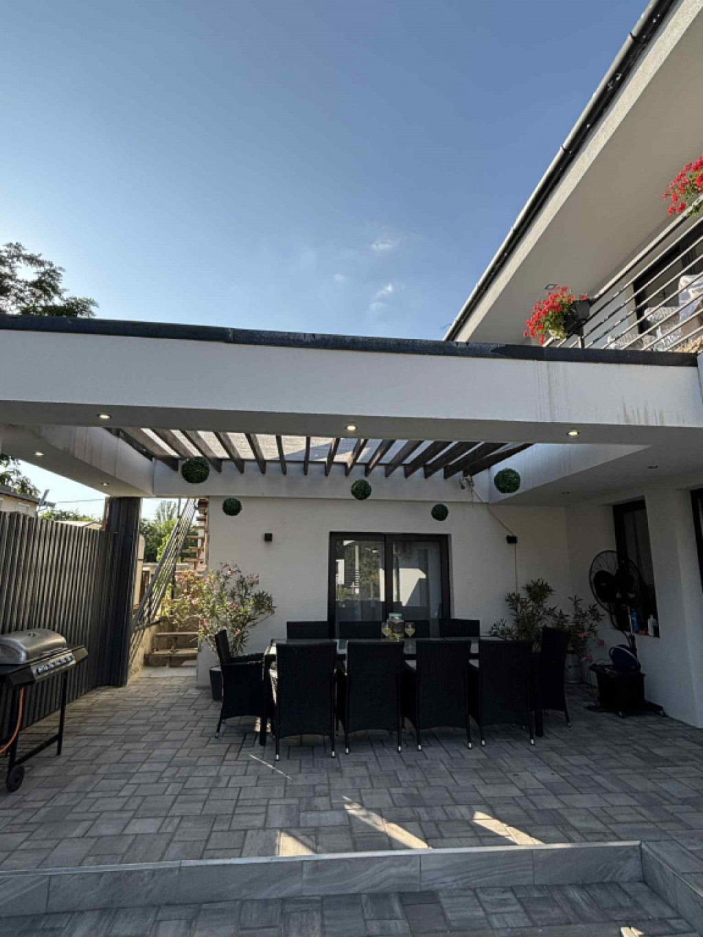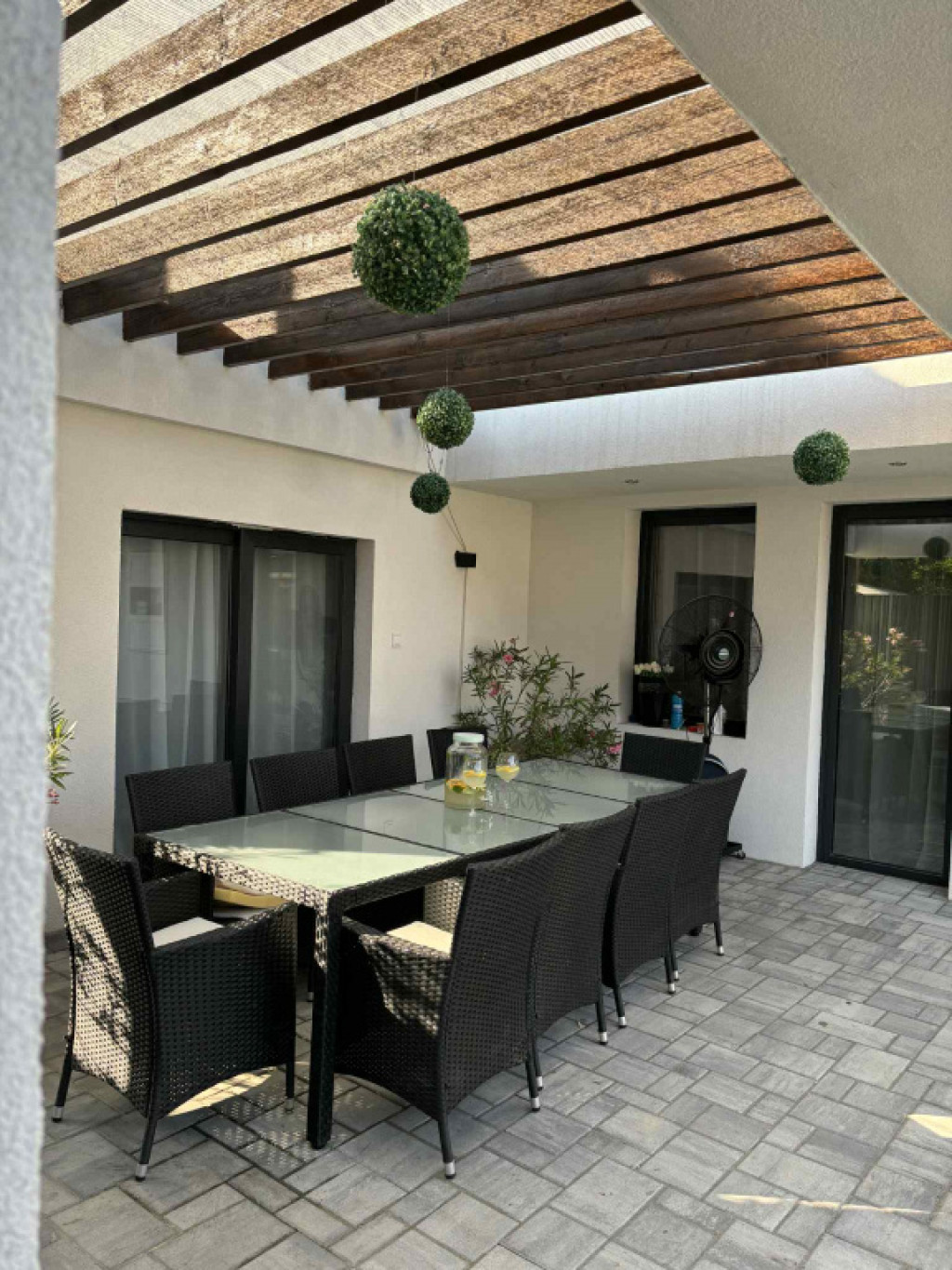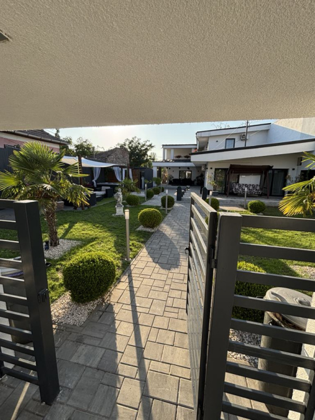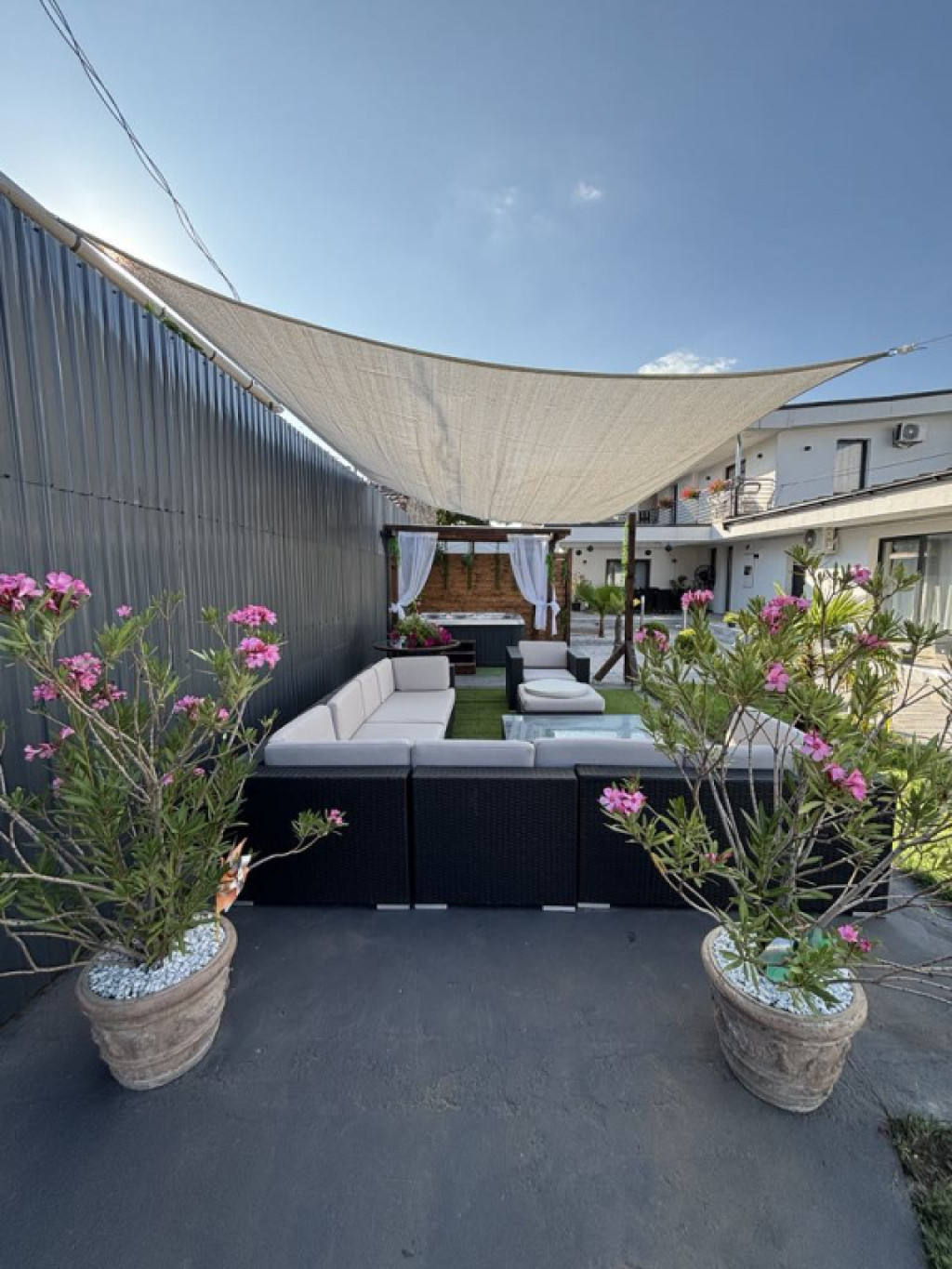 Az ingatlan igazi ékköve a gondosan tervezett, mediterrán hangulatú udvar. A déli tájakat idéző növényzet és a tágas, nyitott tér egy privát oázist teremt a városban. A teljes ellazulásról egy 5 személyes jakuzzi gondoskodik, amely a vételár részét képezi!