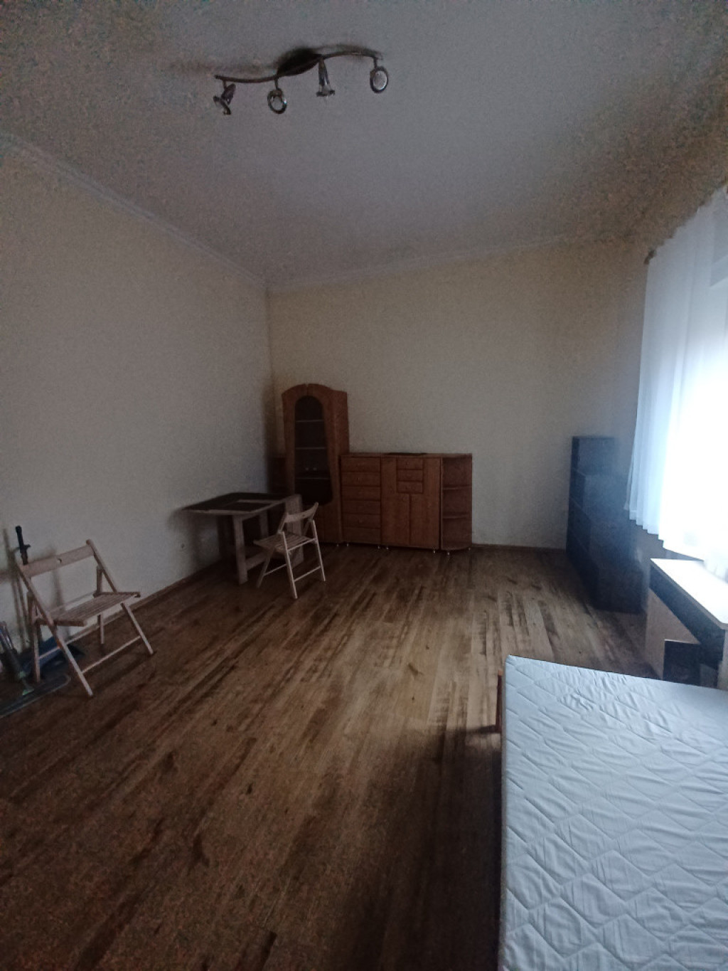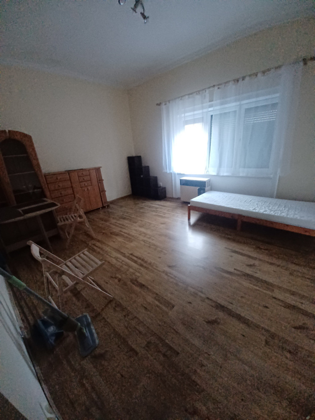 A szoba szalagparkettás, az utcára nyílik, ablaka műanyag,a konyha berendezése beépített, van benne hűtő, mosógép, gáztűzhely.