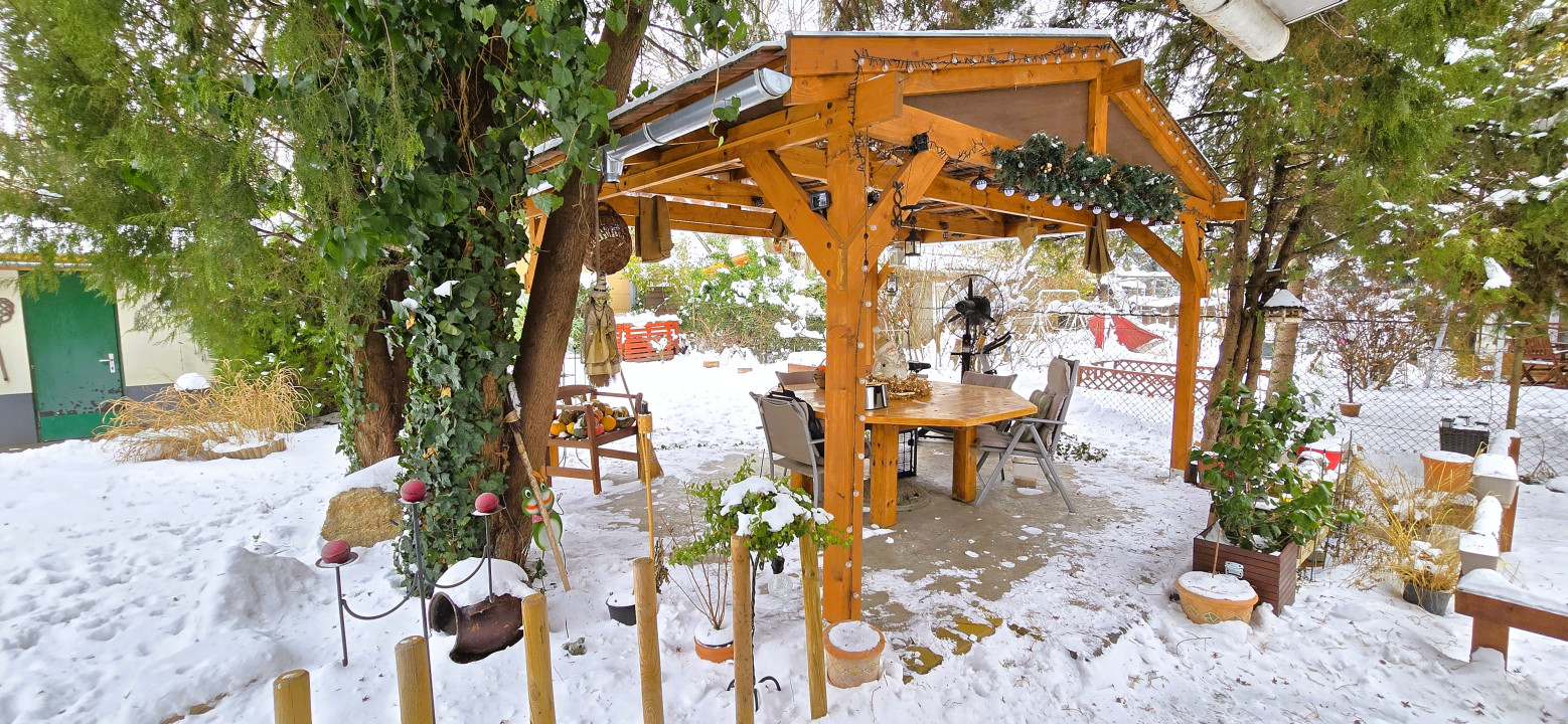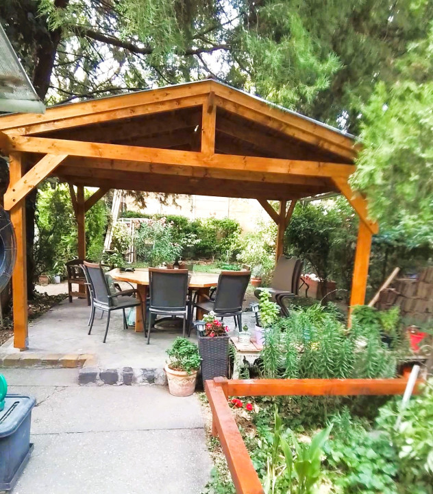 A gondozott kertben kialakított szaletli és sütögető tökéletes helyszíne a nyugodt pihenésnek és a baráti, családi együttléteknek.