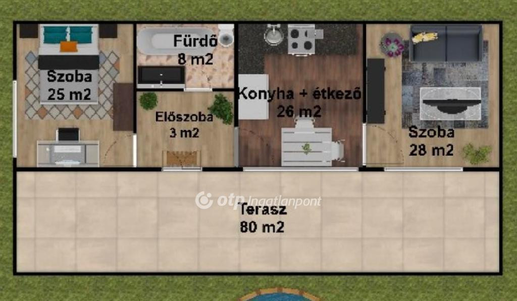 A lakrész (90 nm): előszoba, konyha étkezővel, két szoba, kádas fürdőszoba, valamint egy impozáns, 80nm-es terasz.