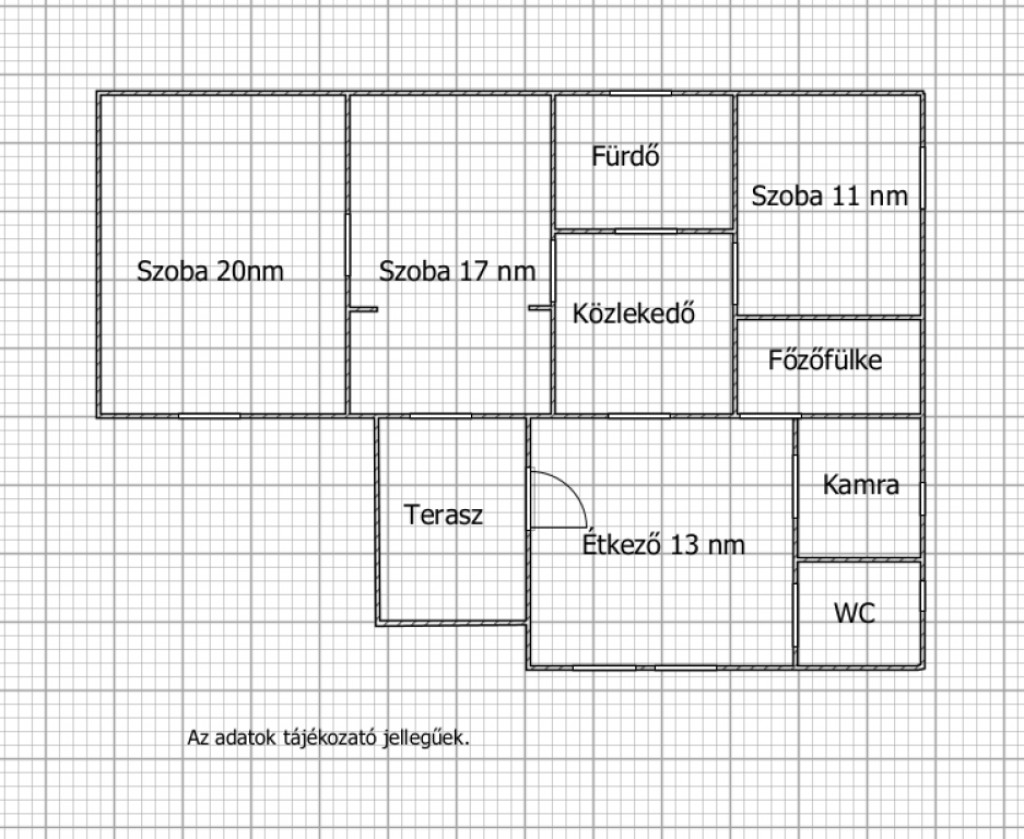 A ház egy szintes, elosztása: 3 szoba (20,17,11 nm), közlekedő, konyha, kamra, fürdőszoba, WC, terasz.