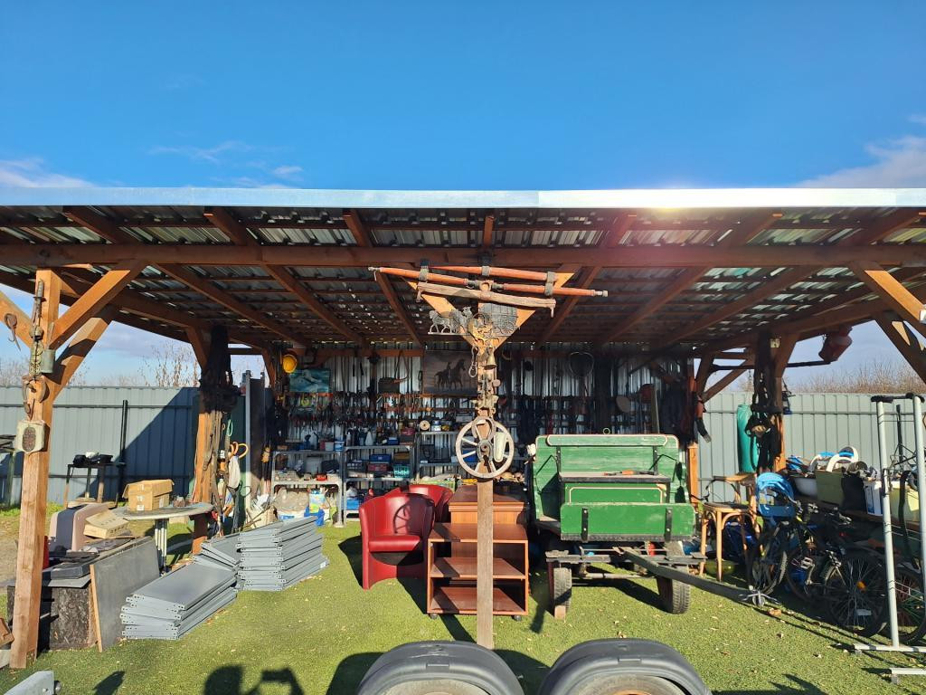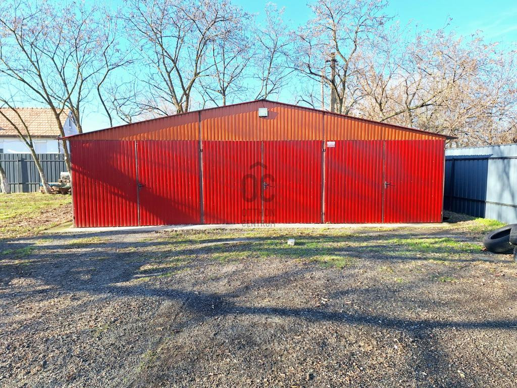 60 m²-es lemezépület, amely 3 autó befogadására alkalmas, valamint tárolási/raktározási célokat is szolgál.