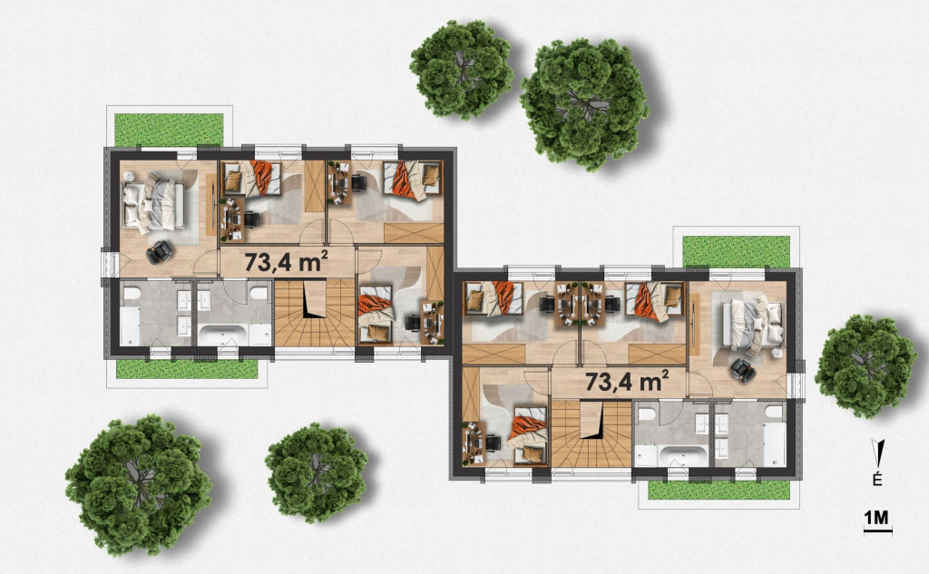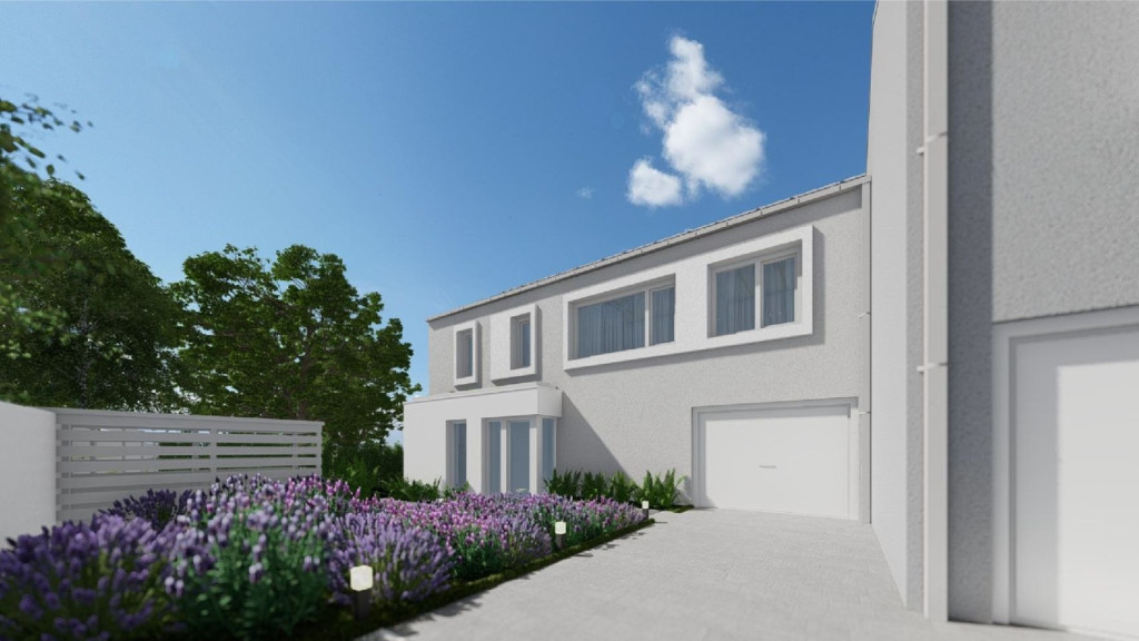 • Klasszikus ikerház, nem egymás mögötti elrendezéssel – maximális intimitás és privát élettér.