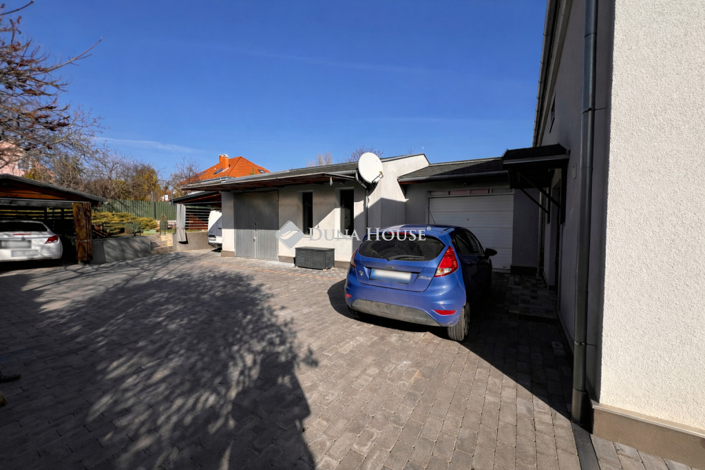 A házhoz tartozó 1068 m²-es telek tágas és jól használható kertet biztosít, amely ideális pihenésre, családi programokra vagy baráti összejövetelekre. A kert egyik különleges eleme a medence, amely a nyári időszakban kellemes kikapcsolódási lehetőséget kínál. A telken egy különálló pince is található, amely praktikus tárolási vagy egyéb funkcionális célokra is alkalmas. A gépjárművek elhelyezéséről garázs, valamint két fedett gépkocsibeálló gondoskodik, így a parkolás minden körülmények között kényelmesen megoldott.