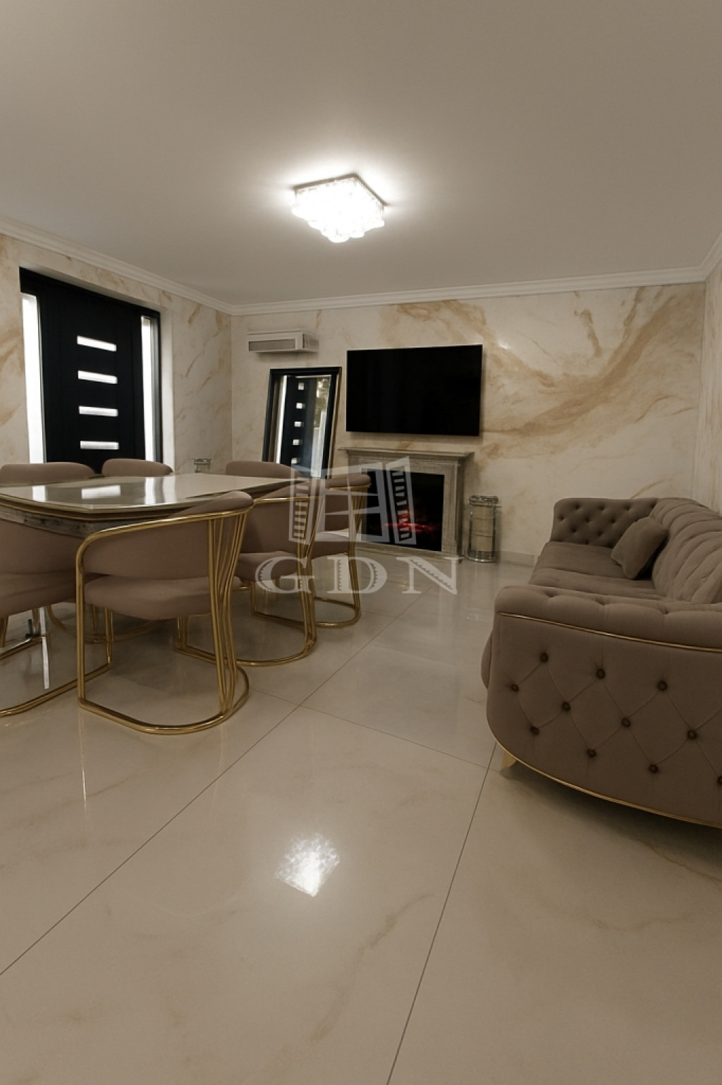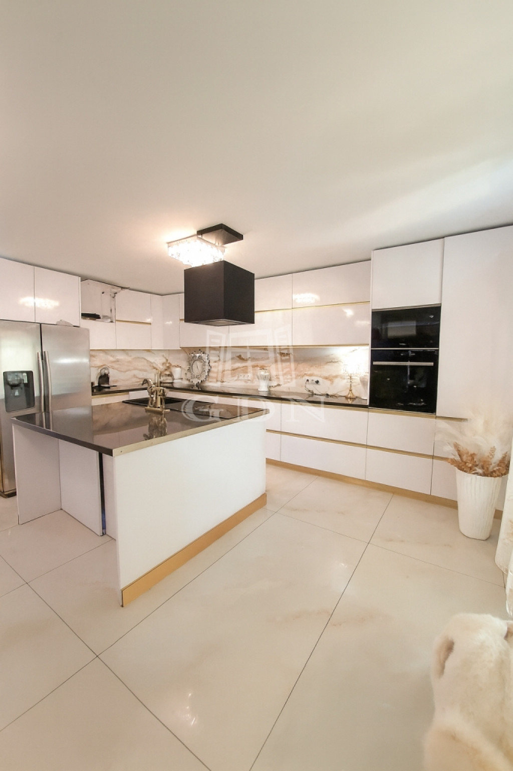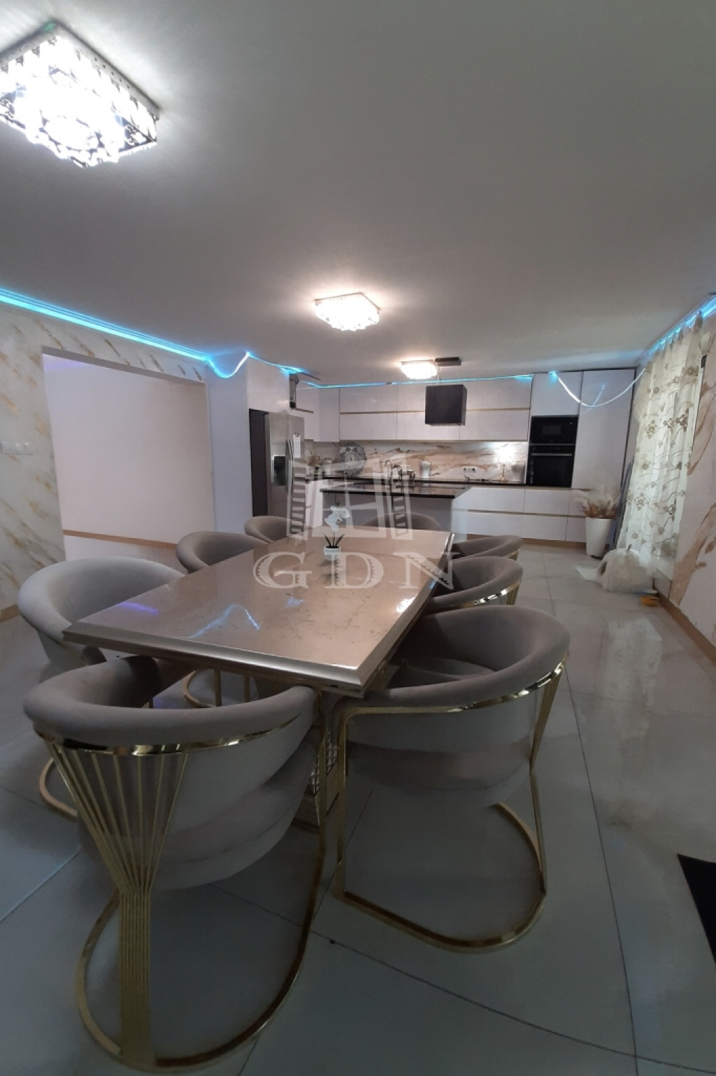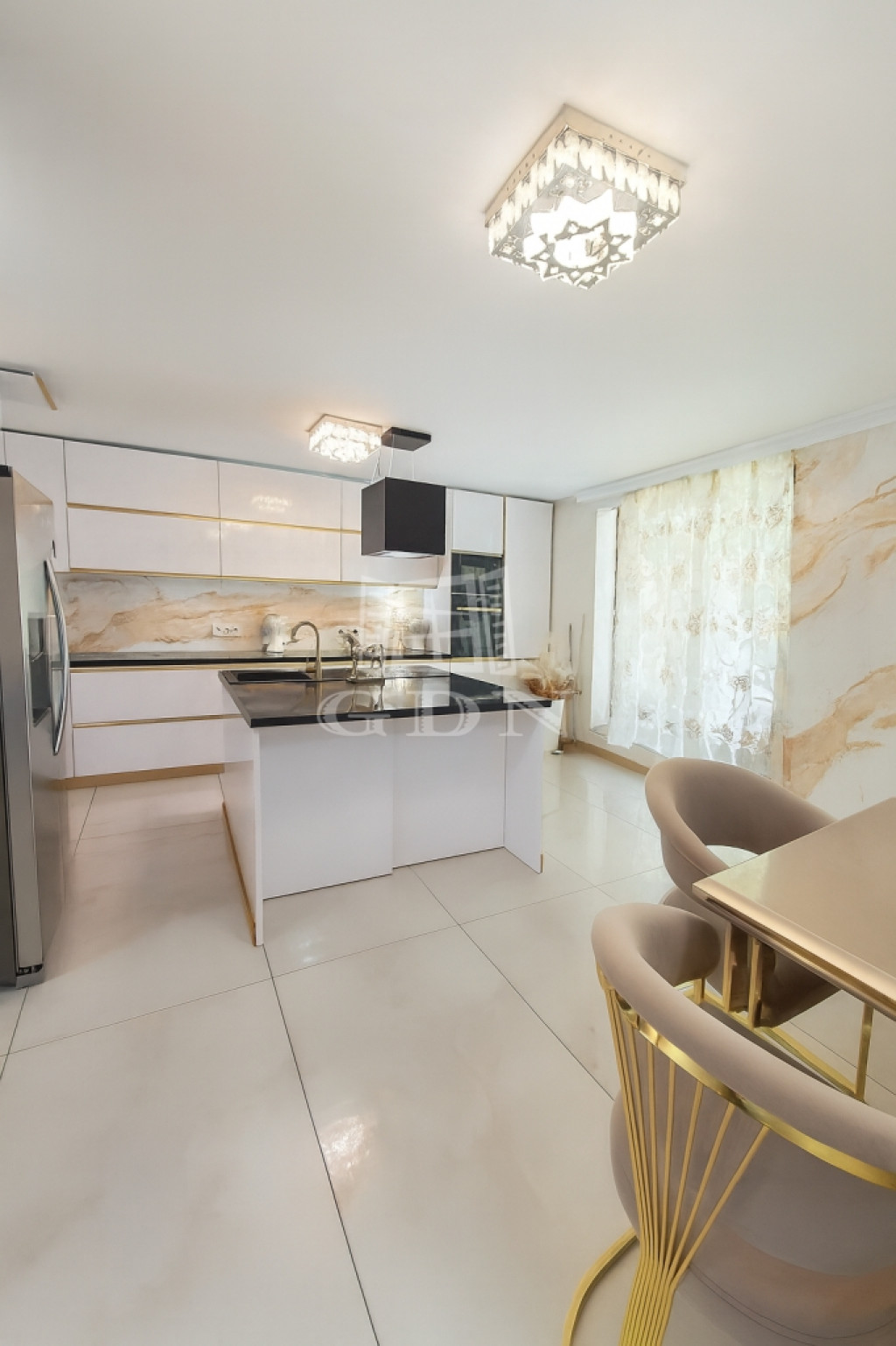 A teraszon áthaladva a látogató egy tágas nappaliba érkezik, amely étkezővel és modern amerikai konyhával van kialakítva.