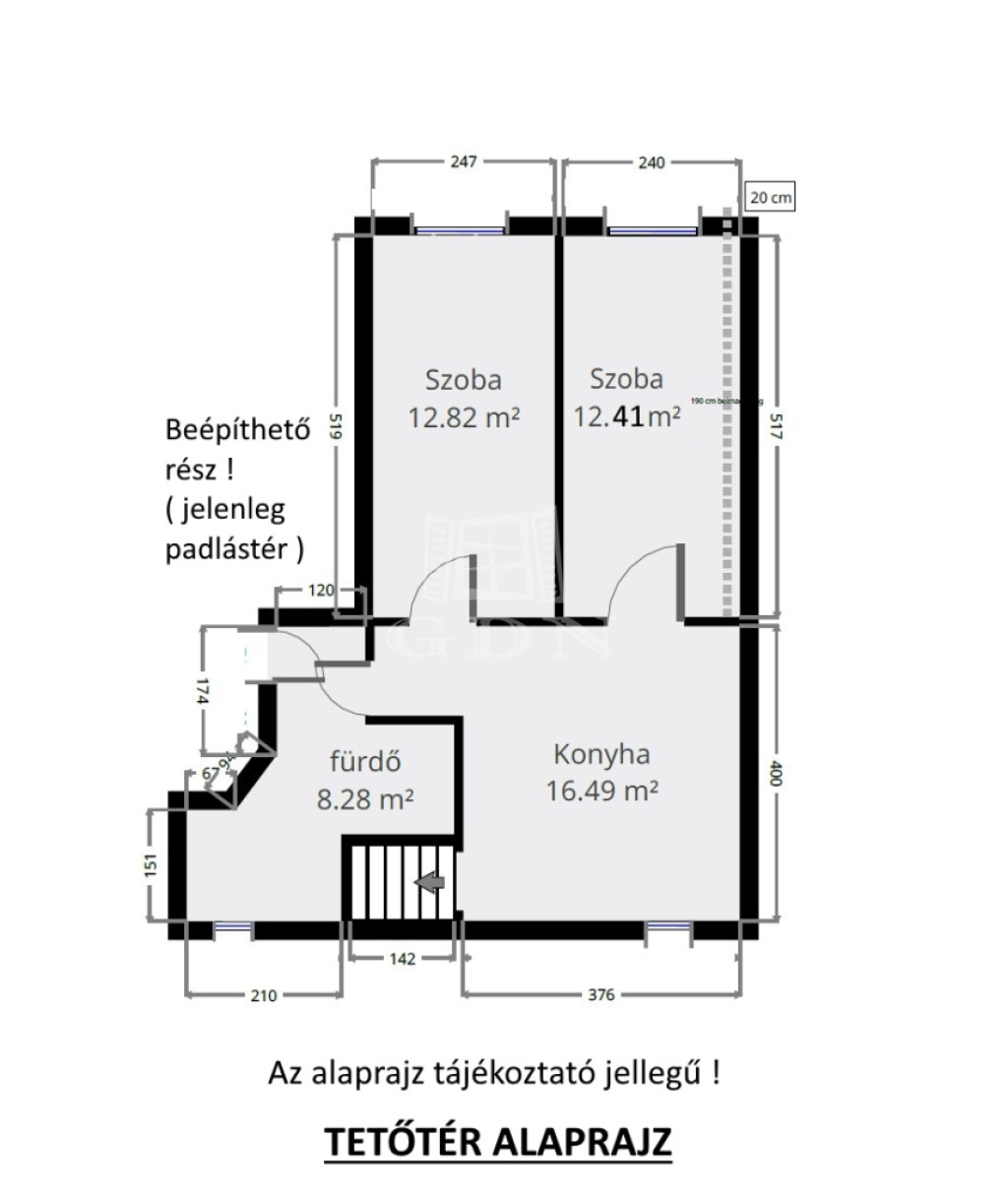 Az emeletre az előtérből vezet fel a lépcső, ahol két további szoba, egy konyha és egy fürdőszoba kapott helyet. A tetőtéri részben további plusz szoba kialakítására is van lehetőség a fürdőszoba mellett, jelenleg egy légtér ( padlástér) .