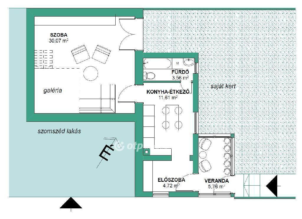 A kerten keresztül érkezünk a bejárati verandára, majd az előszobába. A lakásban egy jól felszerelt konyha-étkező, egy fürdőszoba és egy nagy méretű, nagy belmagasságú, alvó galériával kibővített szoba található. Innen egy terasz ajtón keresztül a kertbe juthatunk.