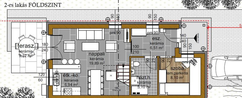 Földszint (46.54m2 + terasz + saját kert): előszoba (6.51m2), háztartási helyiség (5.1m2), konyha - étkező (6.94m2) - nappali (19.89m2), szoba (8.1m2), terasz (9.12m2).