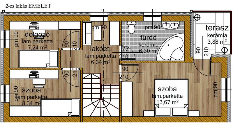 Emelet (41.89m2 + terasz): közlekedő (6.34m2), fürdőszoba + wc (6.3m2), 3 szoba (8.34m2, 7.24m2, 13.67m2), terasz (3.88m2).