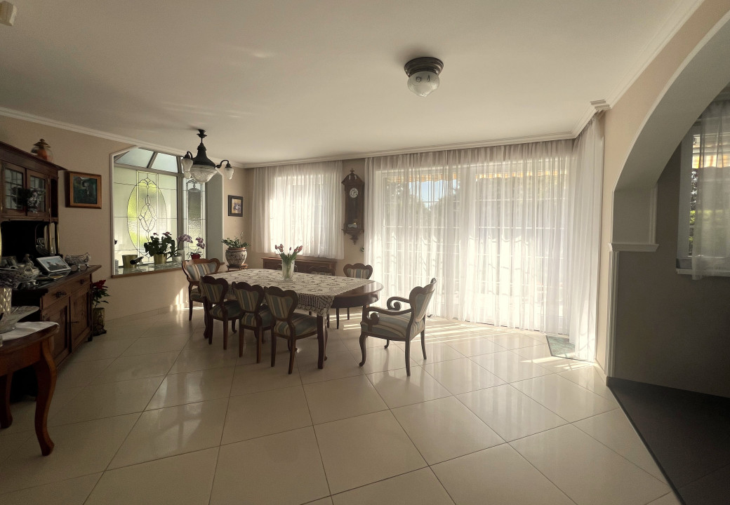 • elegant Living-Dining Area (approx. 32 sqm) – flooded with natural light through large glass surfaces, featuring sliding glass doors with access to the garden terrace.
