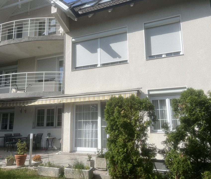 • spacious Living Area (approx. 37 sqm) with a small built-in kitchenette and access to a garden-facing terrace (approx. 7 sqm) extending over the lower-floor terrace.