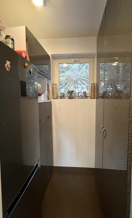 • spacious Kitchen (15 sqm) – connected to the dining area, overlooking the garden terrace through large glass surfaces, equipped with built-in kitchen furniture and appliances, including a kitchen island with a high-performance extractor hood and dining counter.