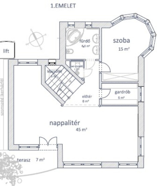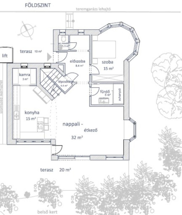 - nagyterű NAPPALI (kb. 45nm), plusz az alsószinti terasz fölé nyúló kertre néző TERASZ (kb. 7nm),