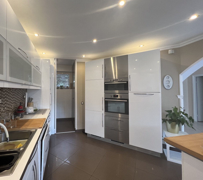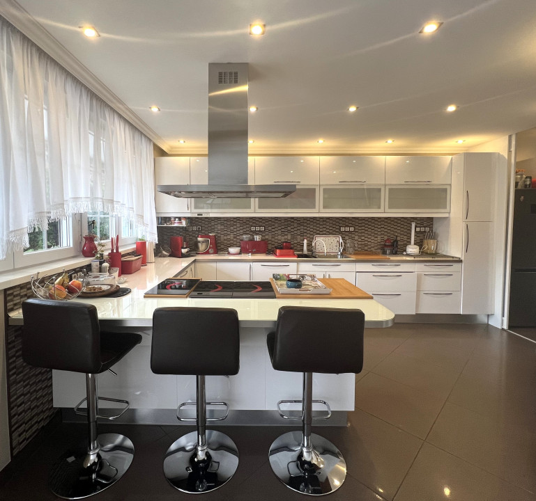 • spacious Kitchen (15 sqm) – connected to the dining area, overlooking the garden terrace through large glass surfaces, equipped with built-in kitchen furniture and appliances, including a kitchen island with a high-performance extractor hood and dining counter.