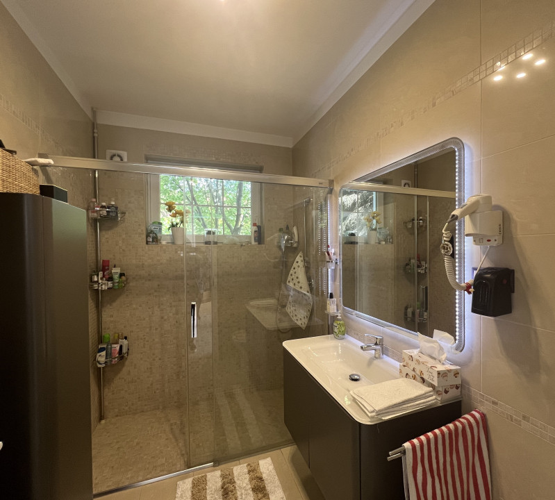 • bathroom – accessible from the living area, featuring a custom-designed glass-enclosed shower space, plus guest washroom