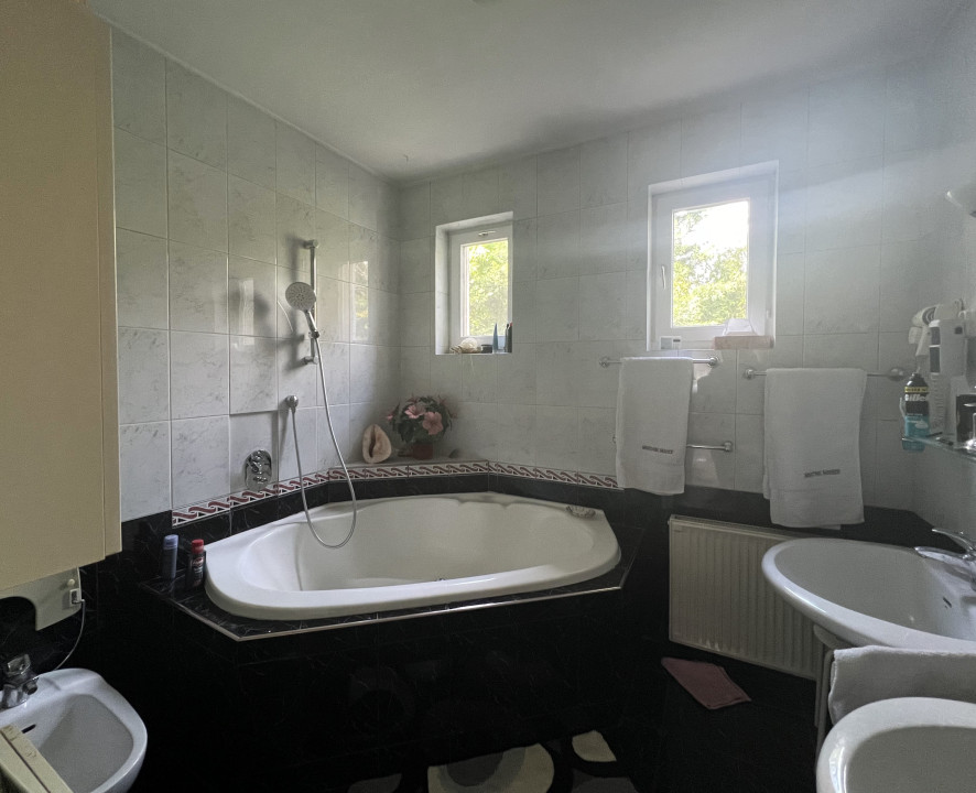 - tágas ablakos sarokkádas bidet-vel is felszerelt tágas fürdőszoba (kb. 6,5nm),