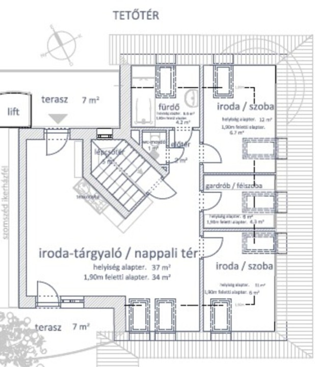 - külső lifttel elérhető teraszról és belső lépcsőházi térből nyílóan akár ÖNÁLLÓ SZINT: jelenlegi iroda vagy akár önálló lakás hasznosításra,