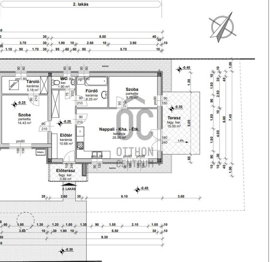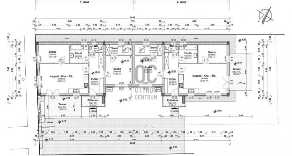 Nettó: 74,5 m² lakórész + 15 m² terasz + 4 m² elő-terasz