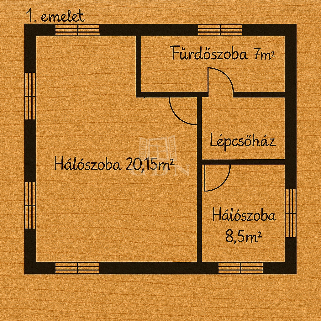 Emelet (41 m² + 9 m² erkély): 2 szoba, fürdőszoba (3 szoba könnyen kialakítható)