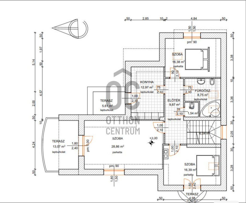 A házhoz tartozik összesen 32 nm-es terasz és 3 erkély 24nm-en, amelyek tökéletes helyszínt nyújtanak a pihenésre, családi összejövetelekre vagy baráti találkozókra.