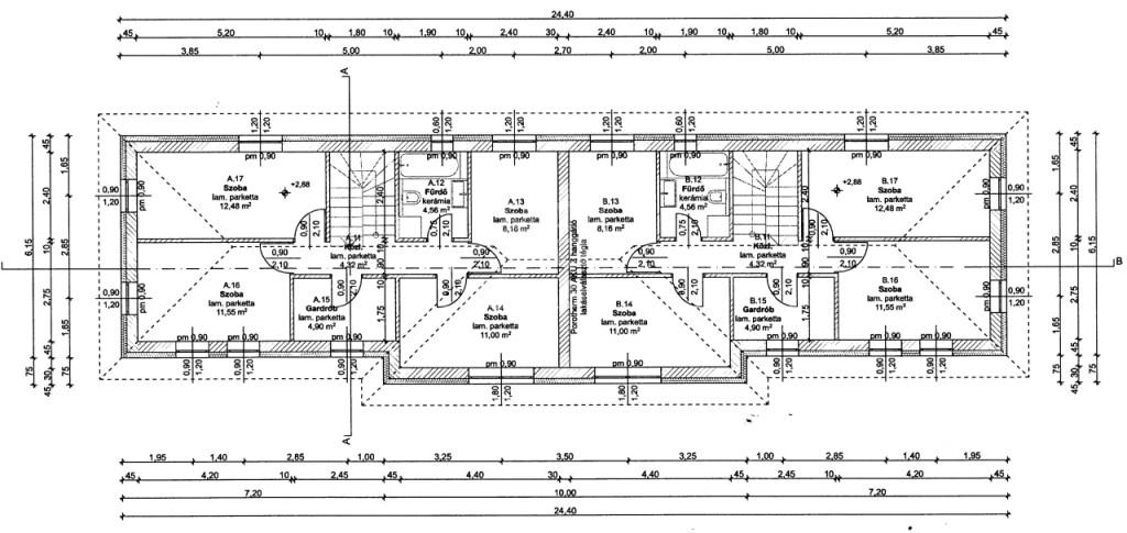 12,48 m2, 8,16 m2, 11 m2) plusz gardrób szoba 4,9 m2.