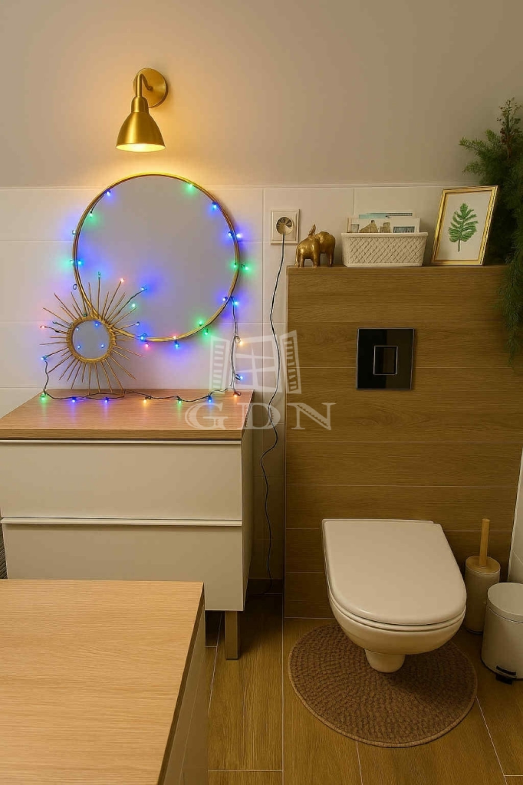 A házban az alsó szinten található az amerikai konyhás nappali étkezővel, a hálószoba és a dolgozóvá alakított előszoba. A fürdőszoba káddal felszerelt. Az emeleten van a vendégszoba.