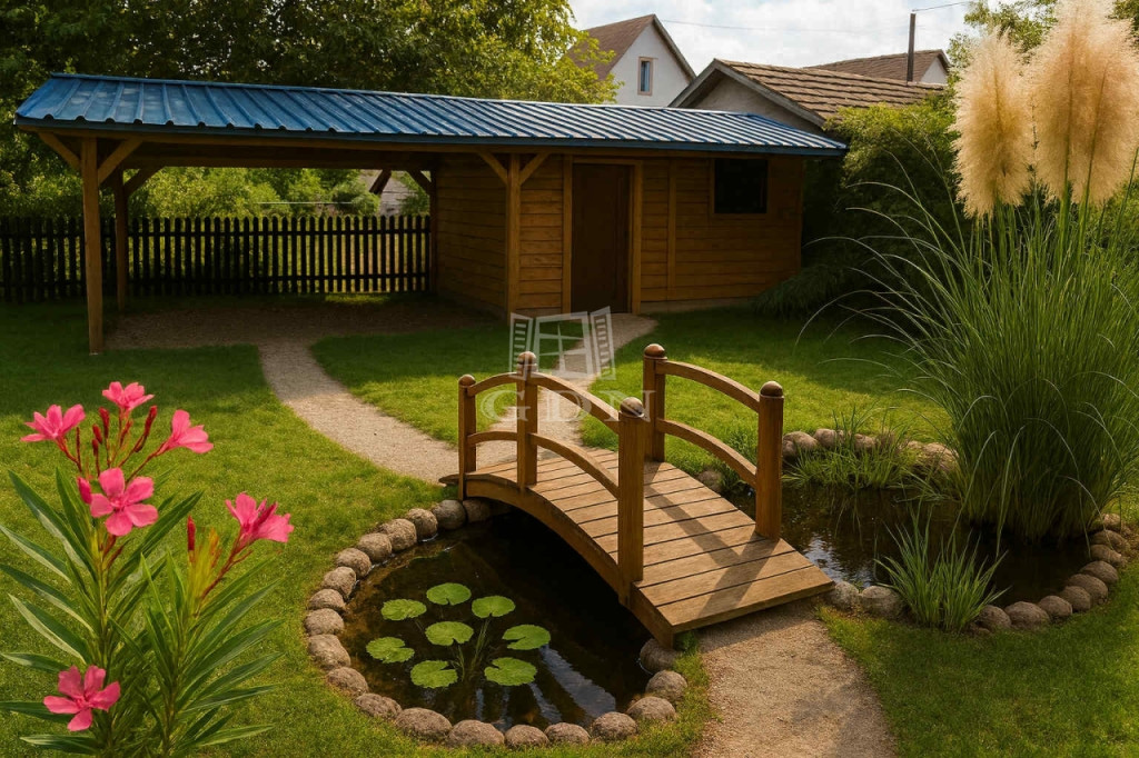 A ház körül közel 300 négyzetméteren kertészkedhetünk, ahol egy dizájnos kis kerti tó is fokozza a hangulatot. Az udvarban helyet kapott még egy 16 négyzetméteres garázs meg egy kút is. Kívülről a házhoz két terasz (2 nm+ 7 nm) kapcsolódik, ahonnan a Dunára nyílik gyönyörű panorámás kilátás. Az udvar, méretéből adódóan medence építéséré is alkalmas.