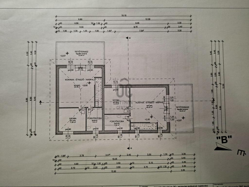 Emelet: két hálószoba (köztük egy 28 m²-es), fürdőszoba-WC, 22,44 m²-es terasz